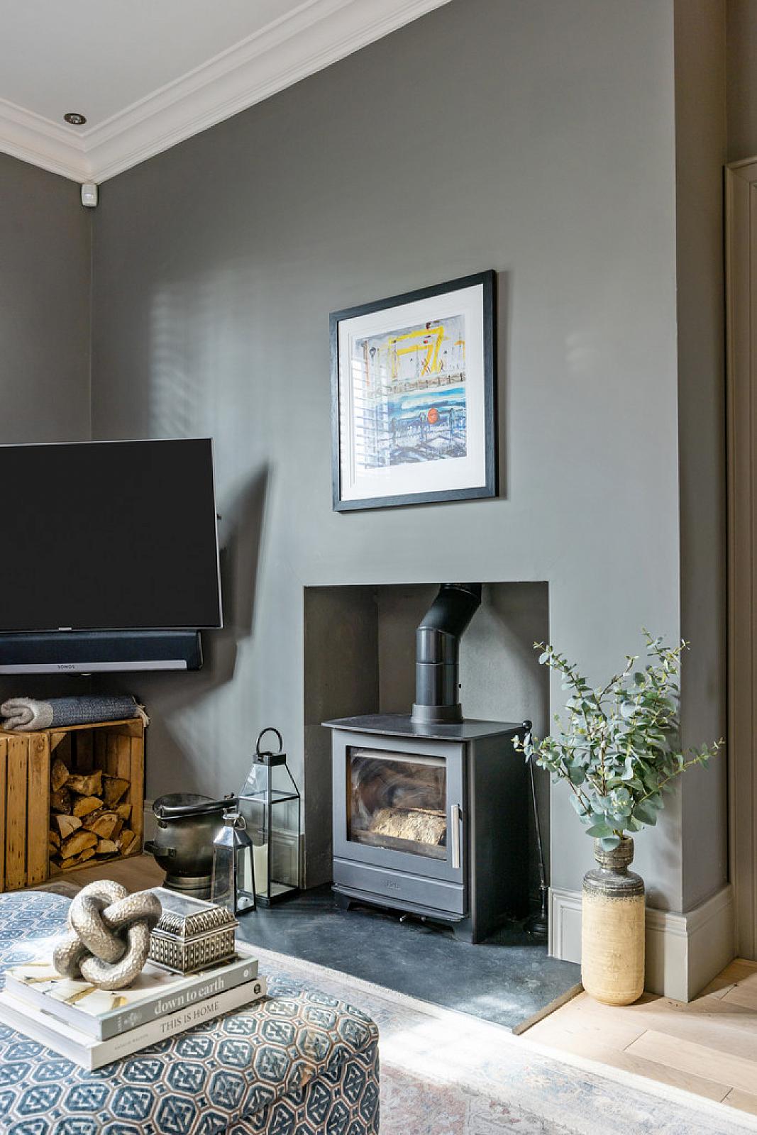 LOUNGE 19' 1" x 11' 7" (5.82m x 3.53m) Wooden flooring, cornice ceiling, Heta cast iron stove with slate hearth, bespoke built-in display shelving and cabinetry, dual aspect windows with Frazer Nolan shutters, zoned underfloor heating.