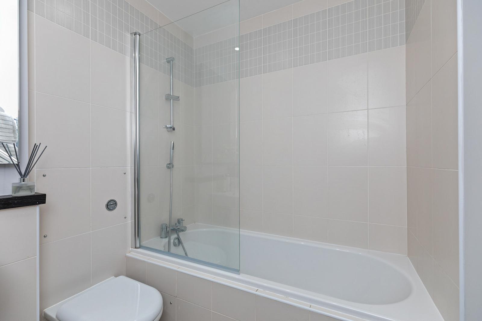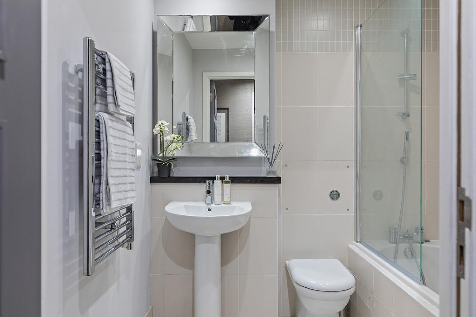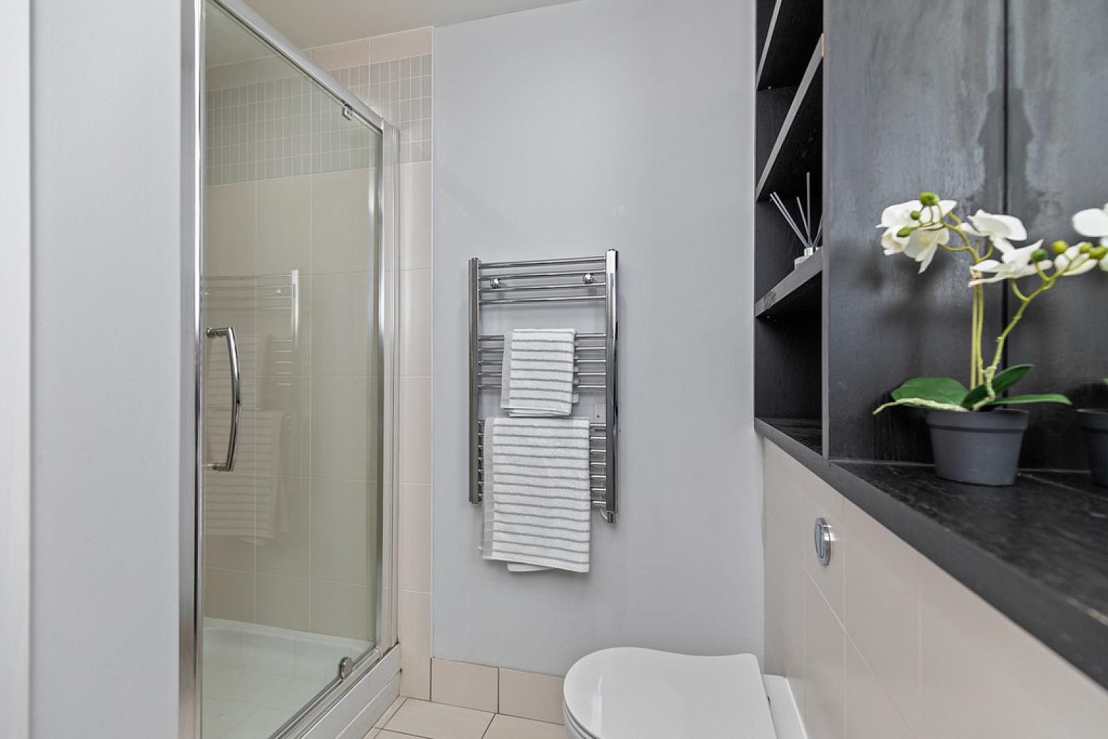 ENSUITE Modern white suite comprising of an enclosed shower cubicle, low flush wc with concealed cistern, pedestal wash hand basin, tiled floor, part tiled walls, stainless steel towel radiator, recessed low voltage spotlights.