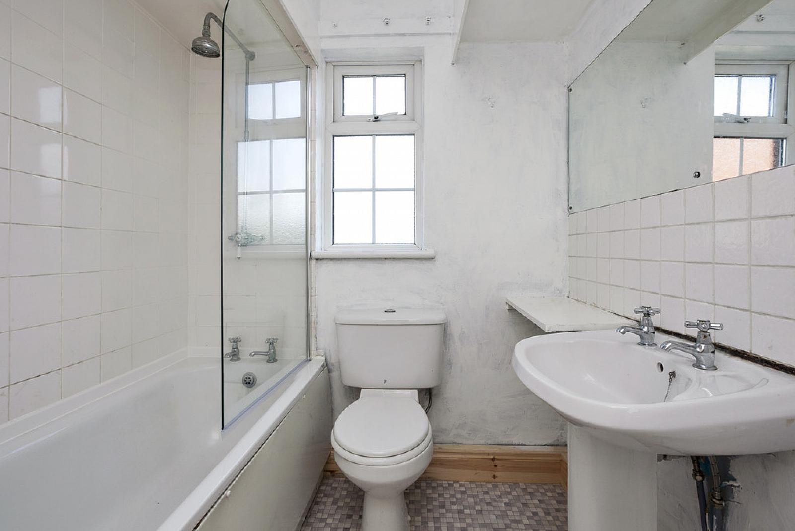 BATHROOM Low flush WC. Pedestal sink with single taps. Bath with single taps and overhead shower. Tiled shower enclosure.
