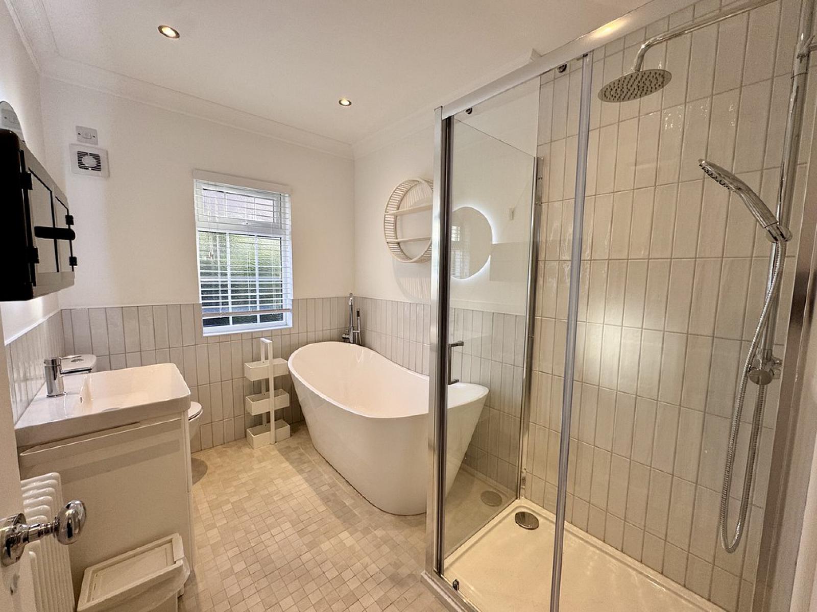 Stylish Bathroom With Shower Enclosure, Luxury Bath, Vanity and WC