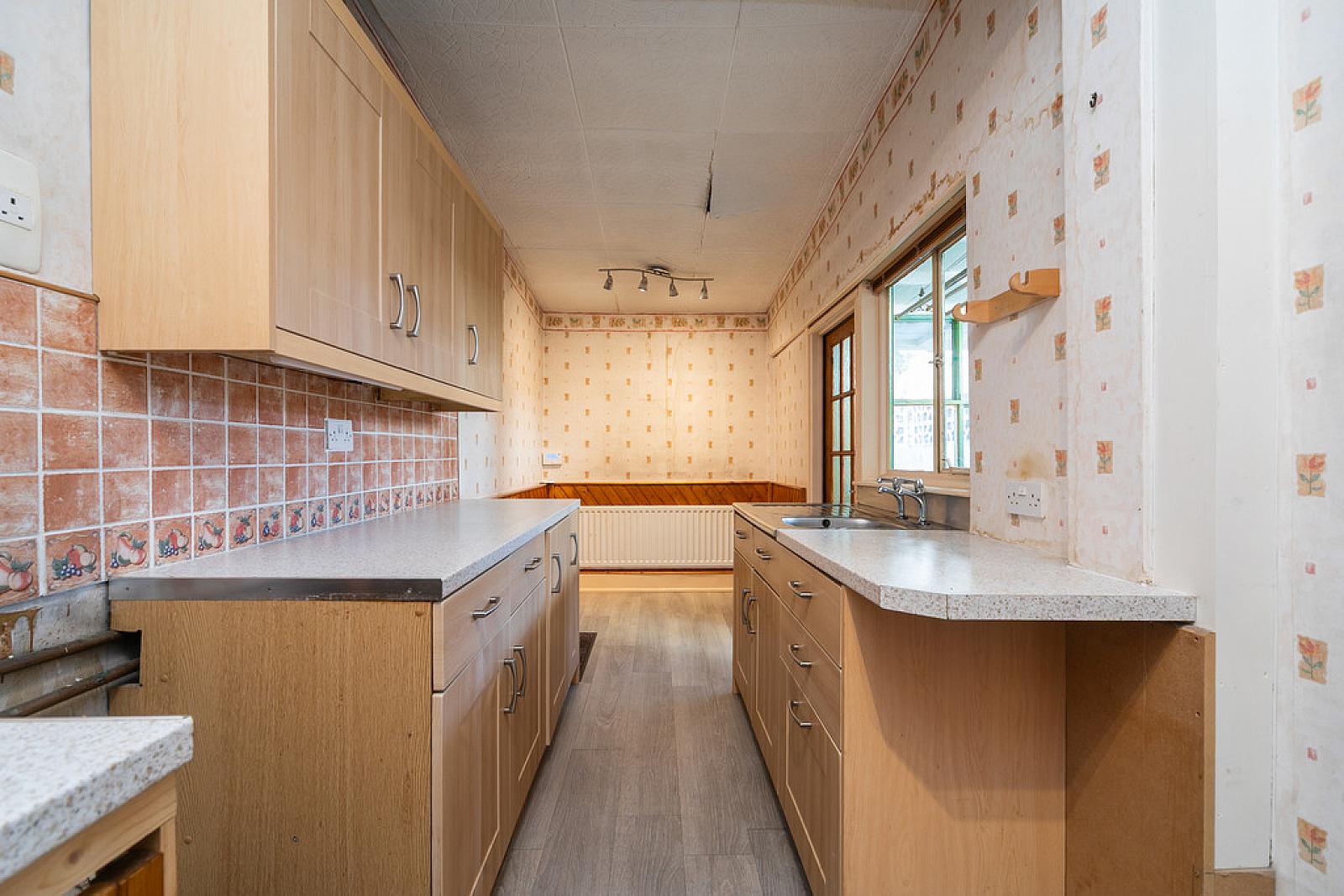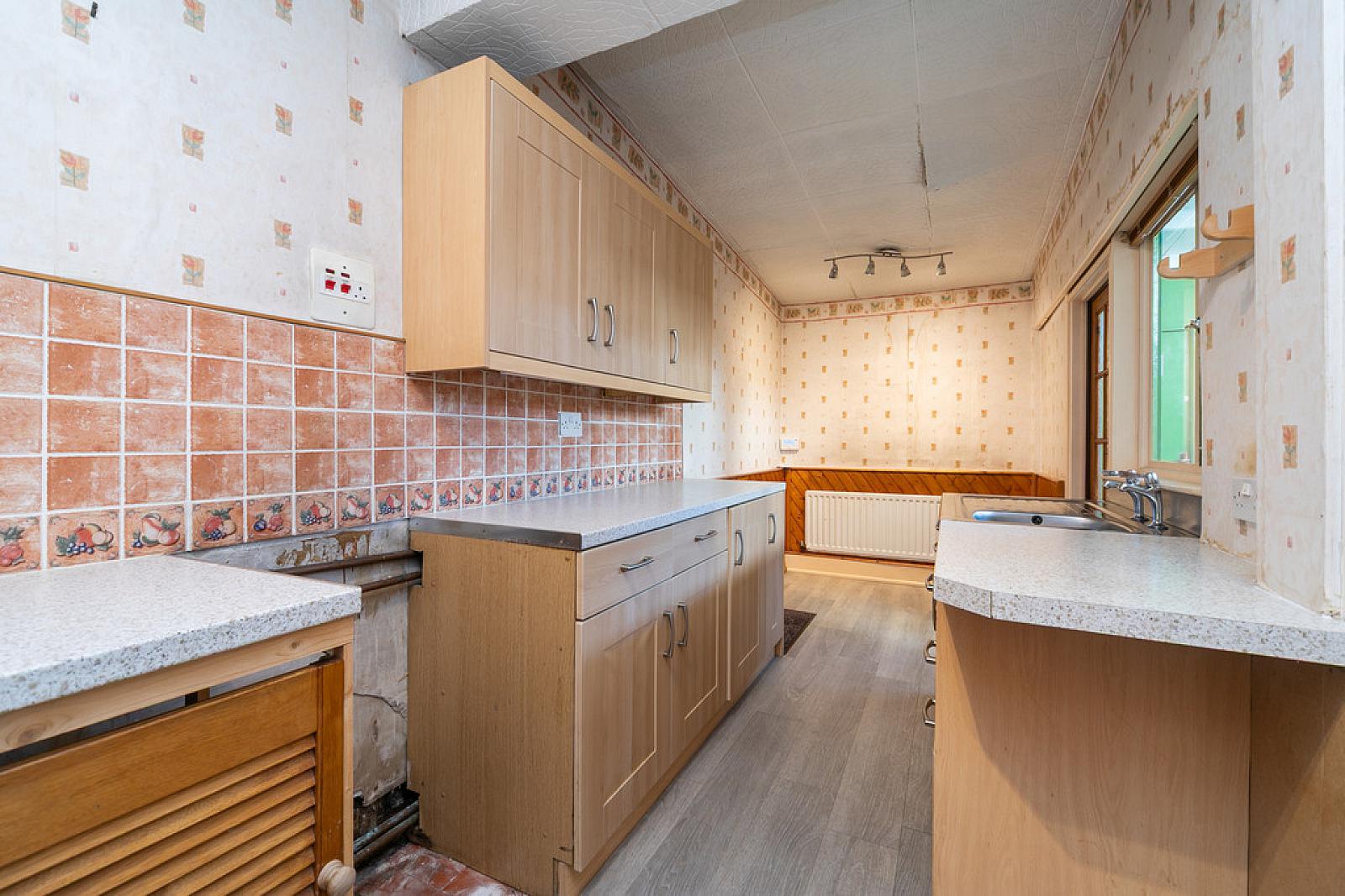 KITCHEN 18' 6" x 6' 4" (5.65m x 1.94m) (@ widest points) Part timber panelled walls, range of fitted high and low level units, stainless steel single drainer sink unit, Formica work surfaces, lagged hot water cylinder.