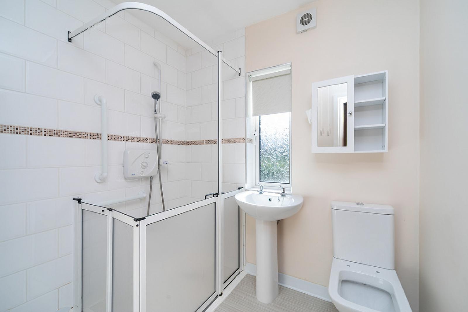 SHOWER ROOM Pedestal wash hand basin, low flush WC, walk in shower enclosure with Triton electric shower, part tiled walls, stainless steel towel radiator.