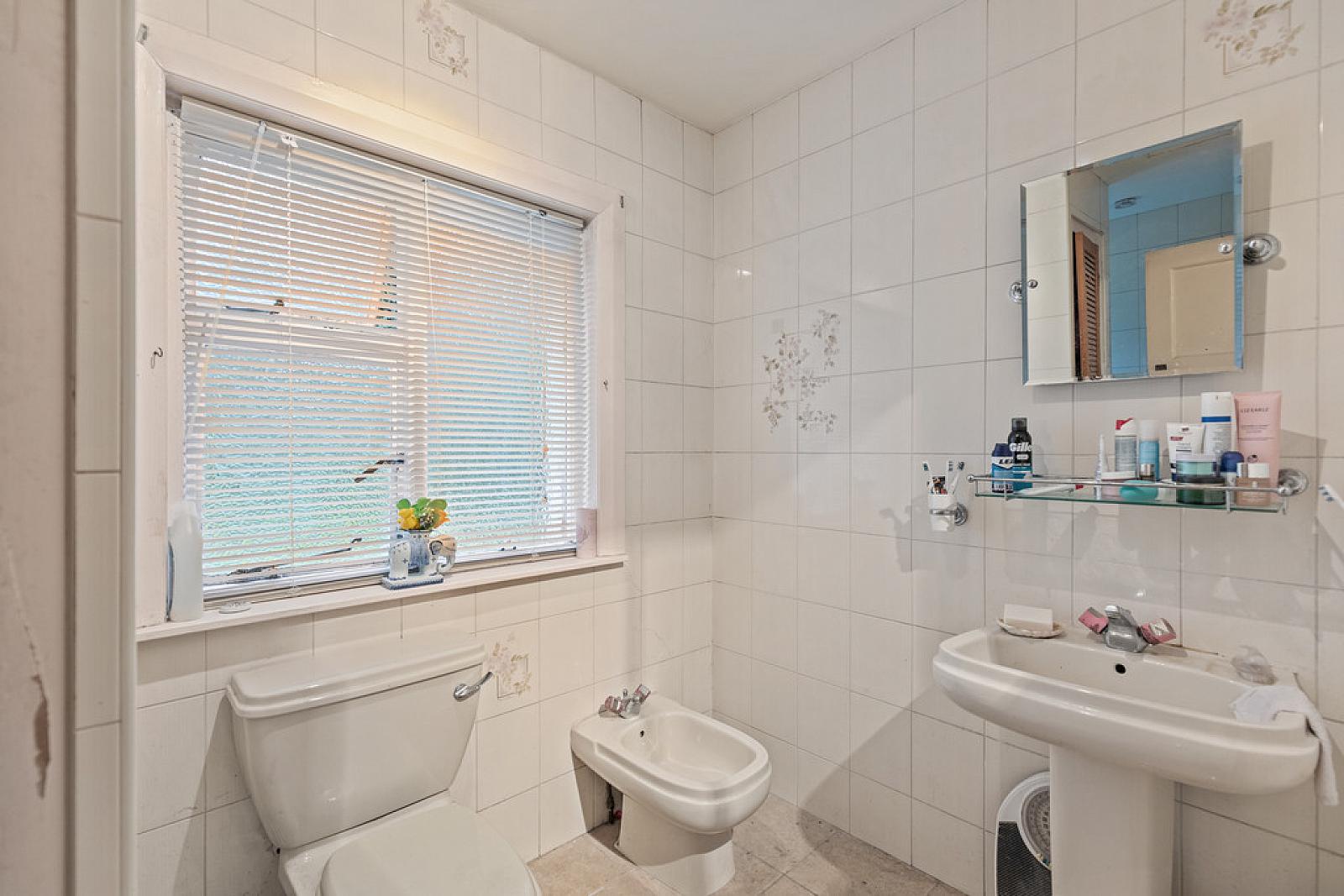 BATHROOM Tiled panelled bath, low flush WC, bidet, pedestal wash hand basin, fully tiled walls, tiled floor, hot press.