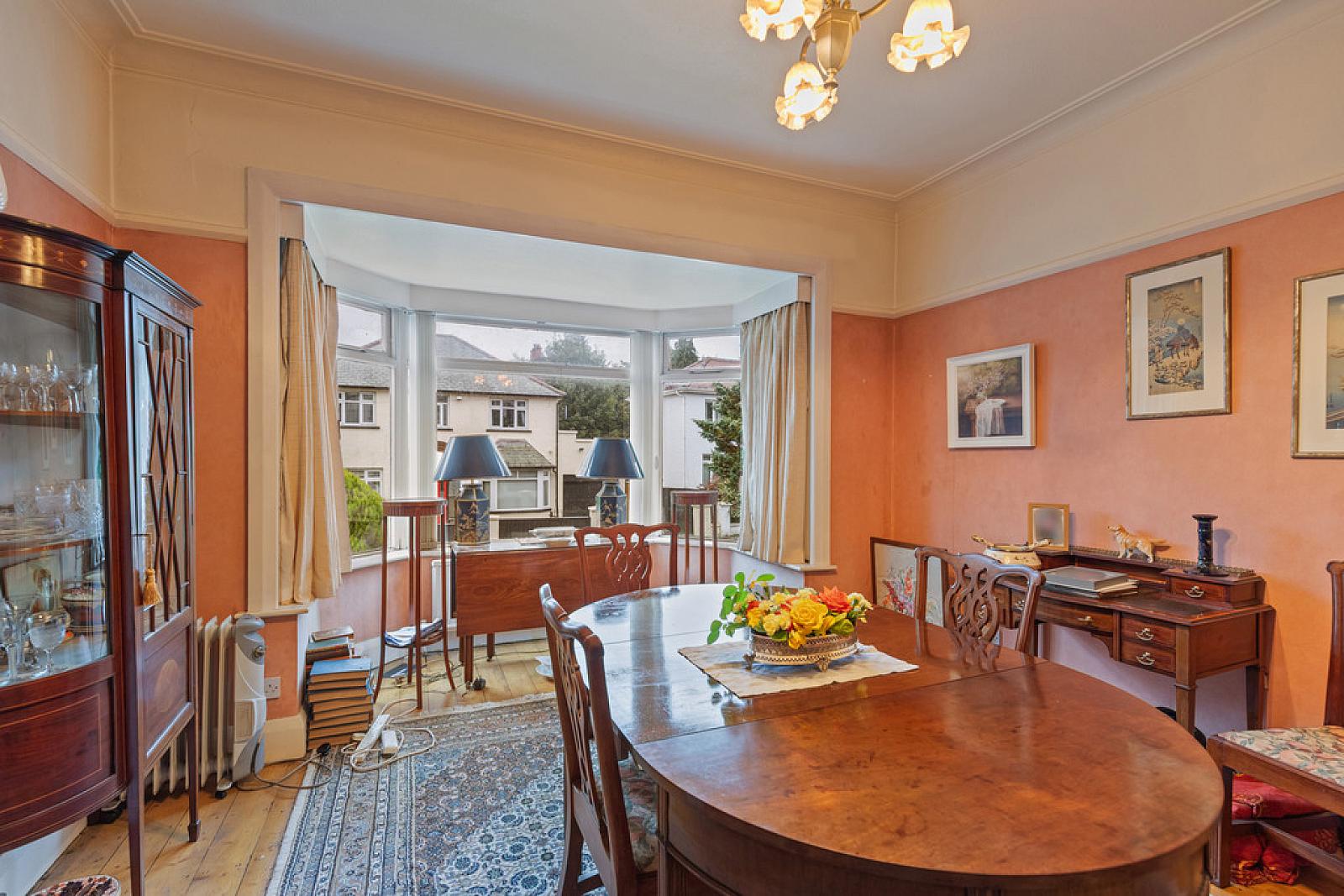 DINING ROOM 18' 7" x 12' 4" (5.66m x 3.76m) Wood flooring, Inglenook marble fireplace with slate hearth, cornice ceiling, picture rail, bay window.