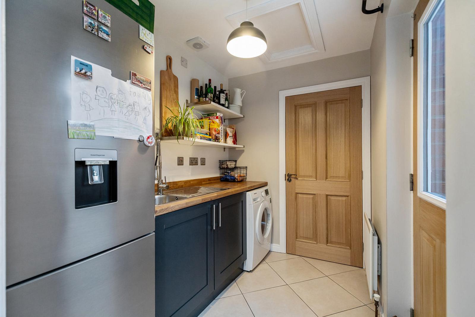 UTILITY ROOM 8' 0" x 5' 10" (2.46m x 1.78m) Range of units with chrome handles and wood effect work surfaces, stainless steel sink unit, plumbed for washing machine, tiled floor, access to rear garden.