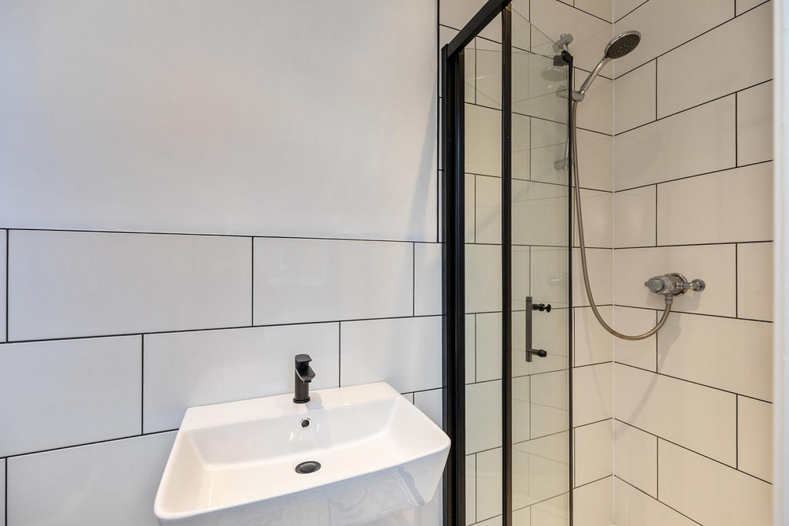 ENSUITE SHOWER ROOM Fully tiled shower cubicle, low flush w.c, pedestal wash hand basin, tiled floor, partly tiled walls, spot lighting.