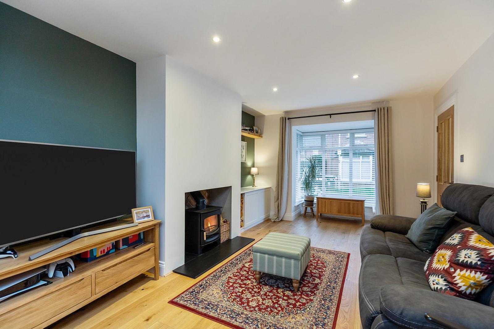 LIVING ROOM 14' 9" x 10' 9" (4.5m x 3.3m) Bay window, wood burning stove by Mourne Fires with Italian slate hearth and a Herringbone style brick recess, engineered wood strip flooring, spot lighting.