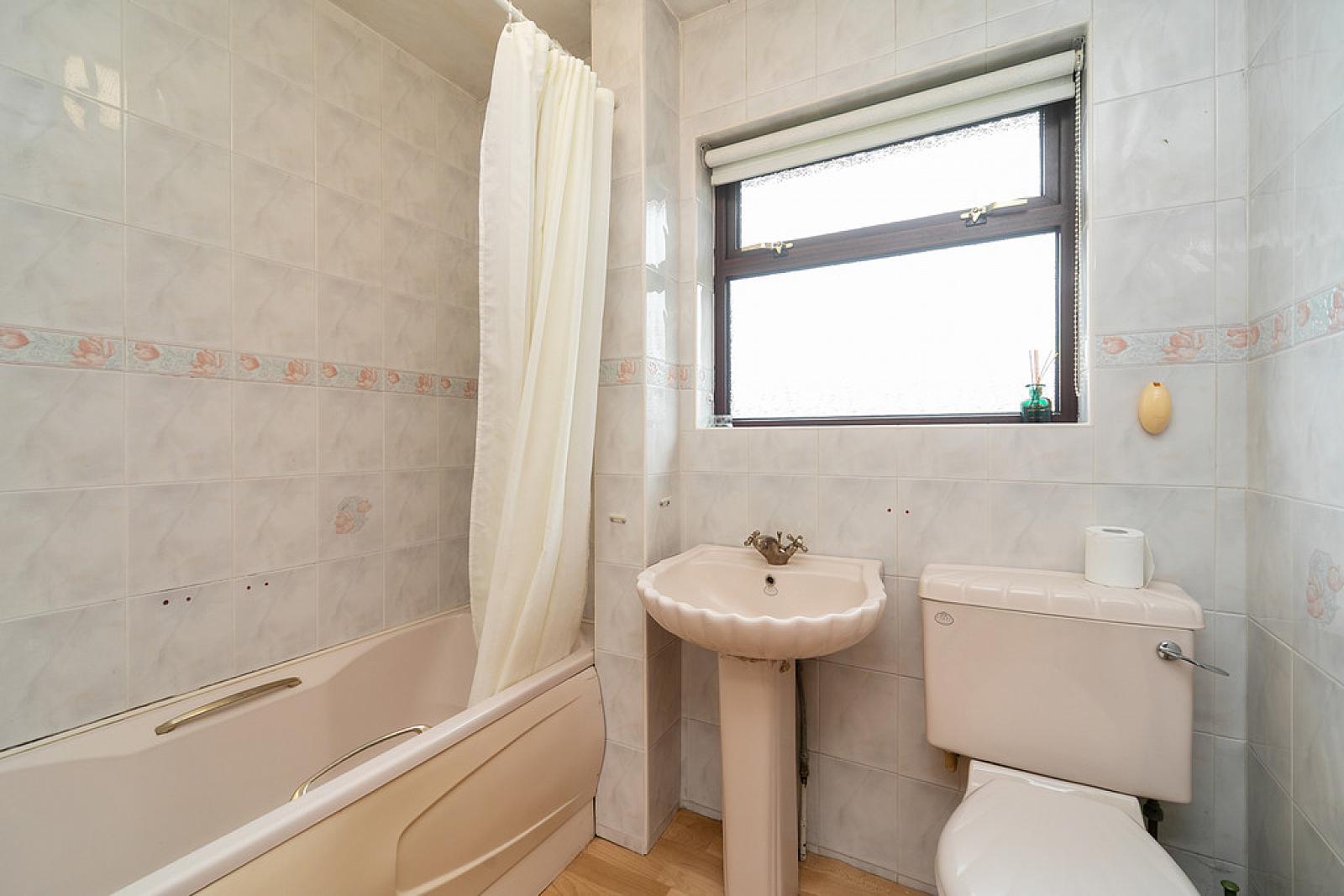 BATHROOM Suite comprising of a panelled bath, pedestal wash hand basin, low flush WC, tiled walls.
