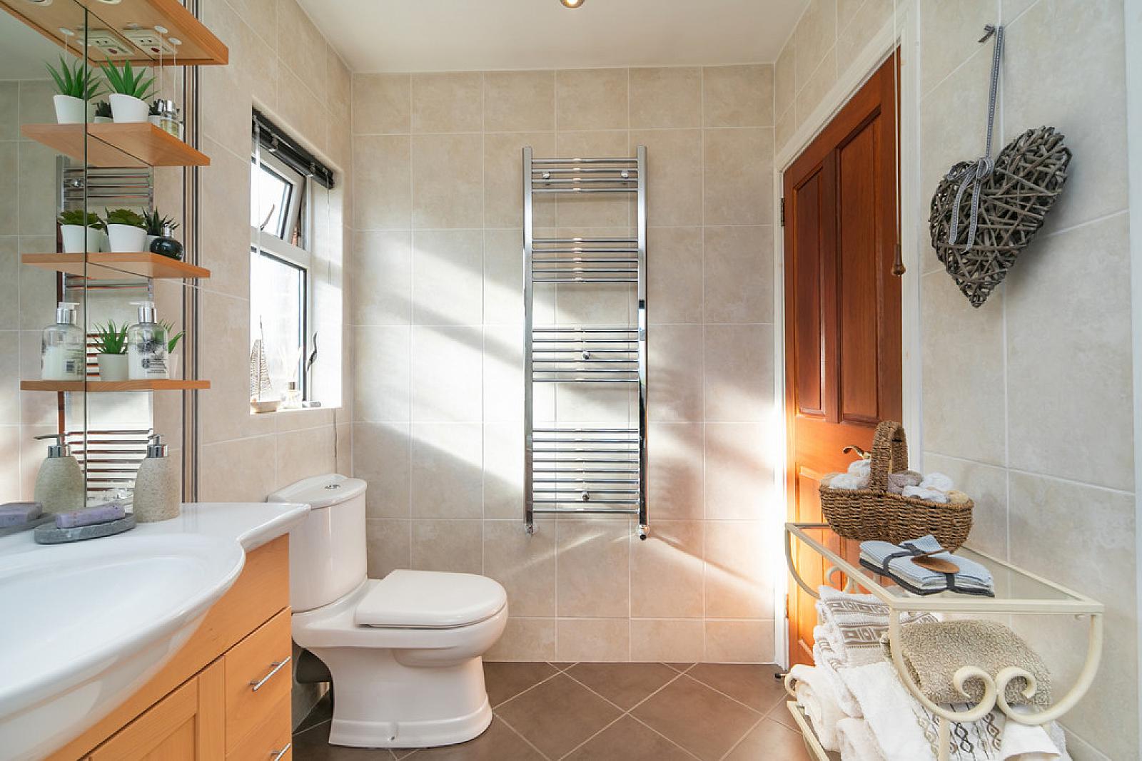 ENSUITE White suite comprising low flush wc, vanity unit with storage, fully tiled shower cubicle with Mira shower, tiled floor, extractor fan.