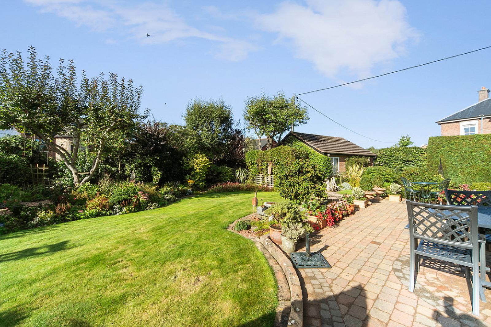 Rear and side garden in beautifully presented lawns and flower beds with boundary planting and fence and generous paviour patio area with a South westerly aspect.