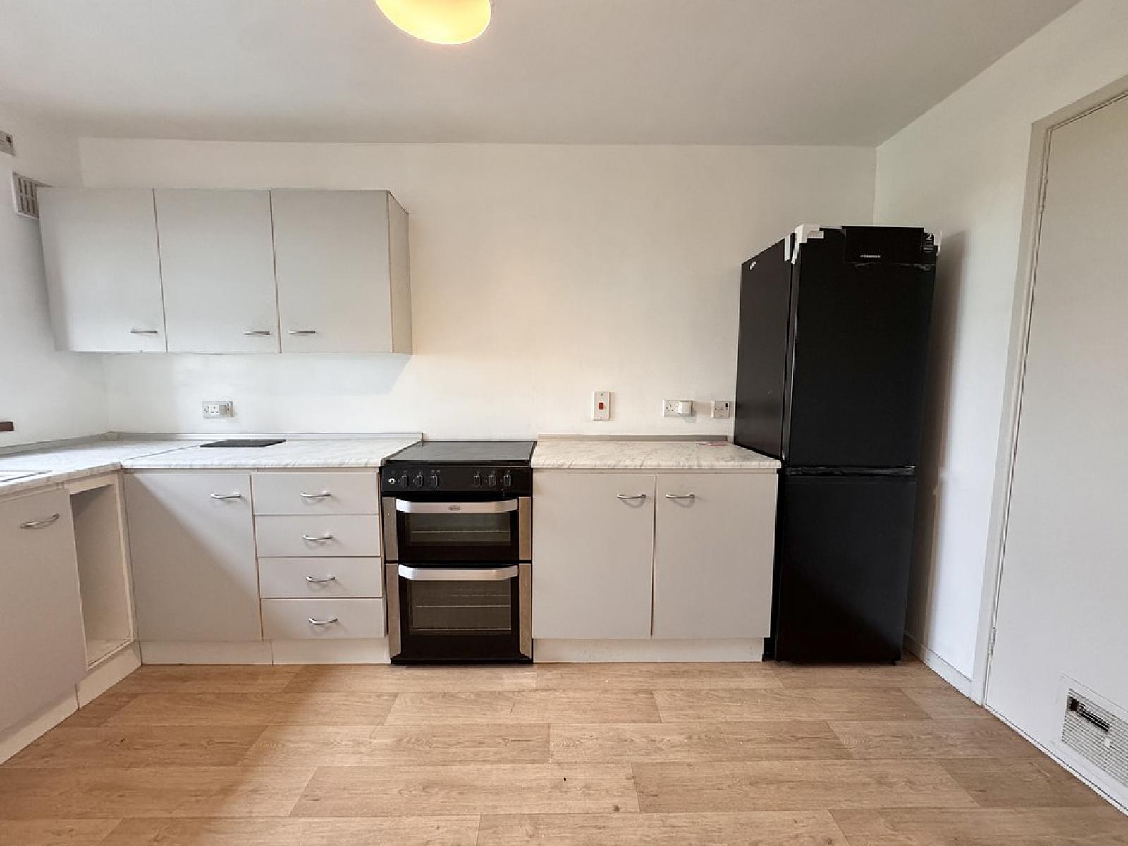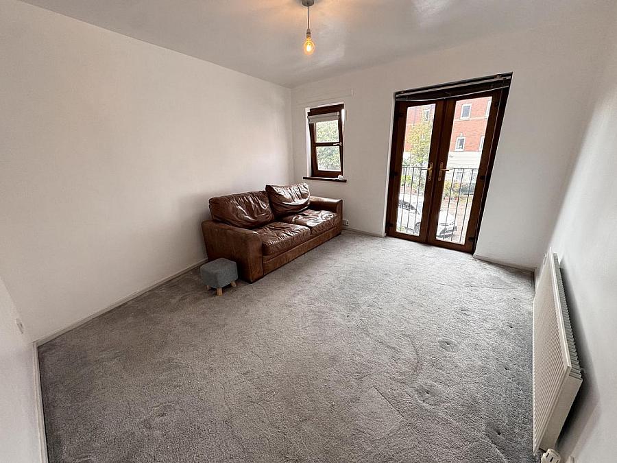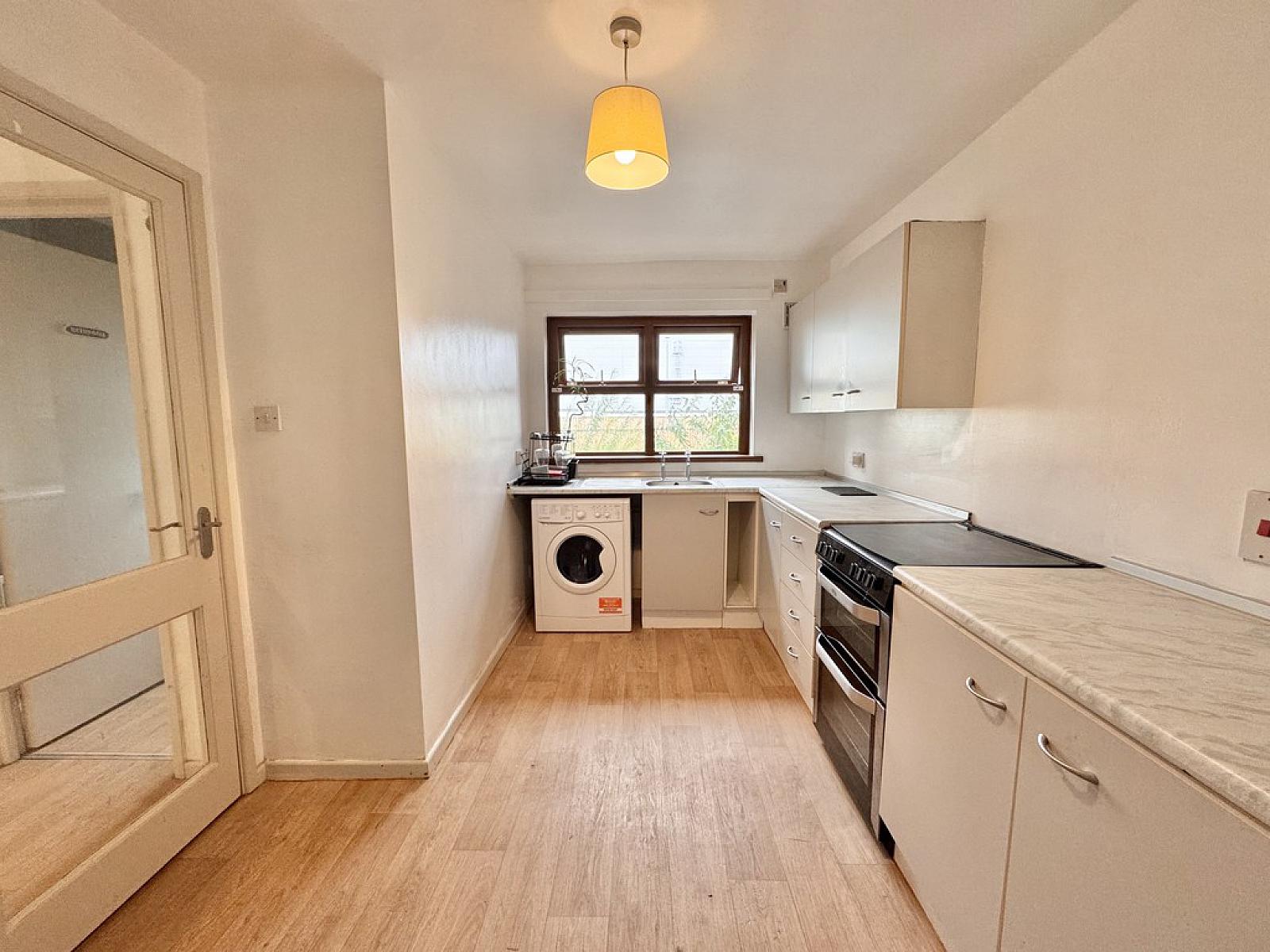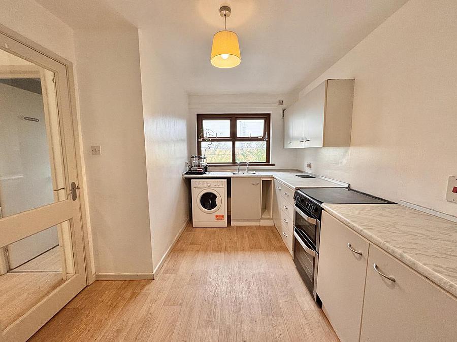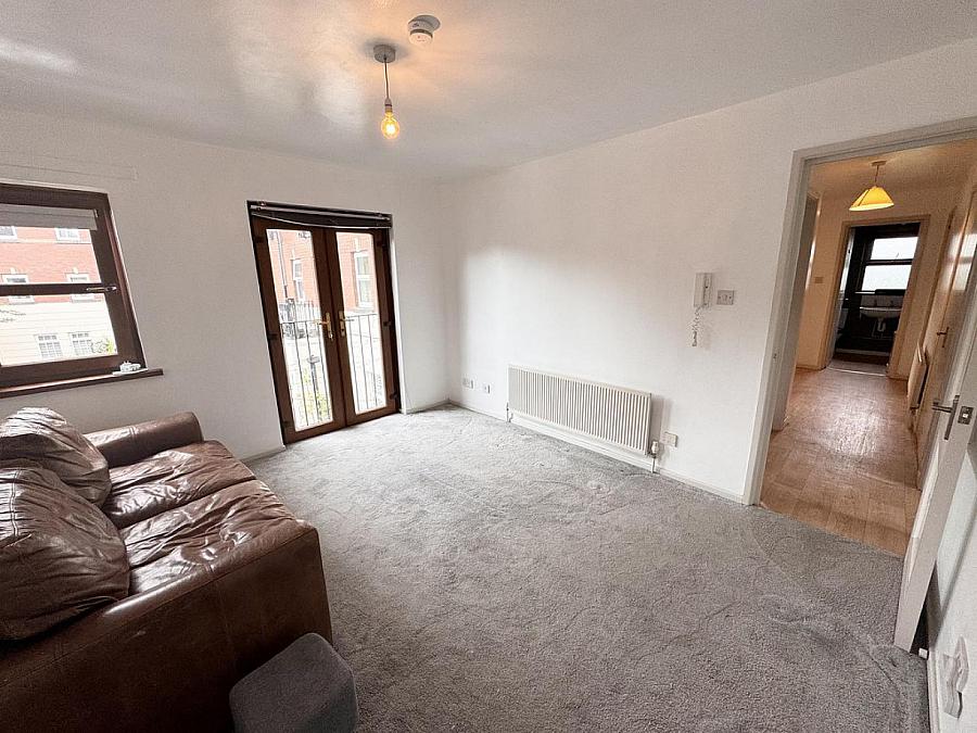 Inside, the spacious hallway leads to a fully fitted kitchen with both high and low-level units and an additional built-in storage cupboard. The bright living room benefits from a feature Juliet balcony, creating a light and airy space.
