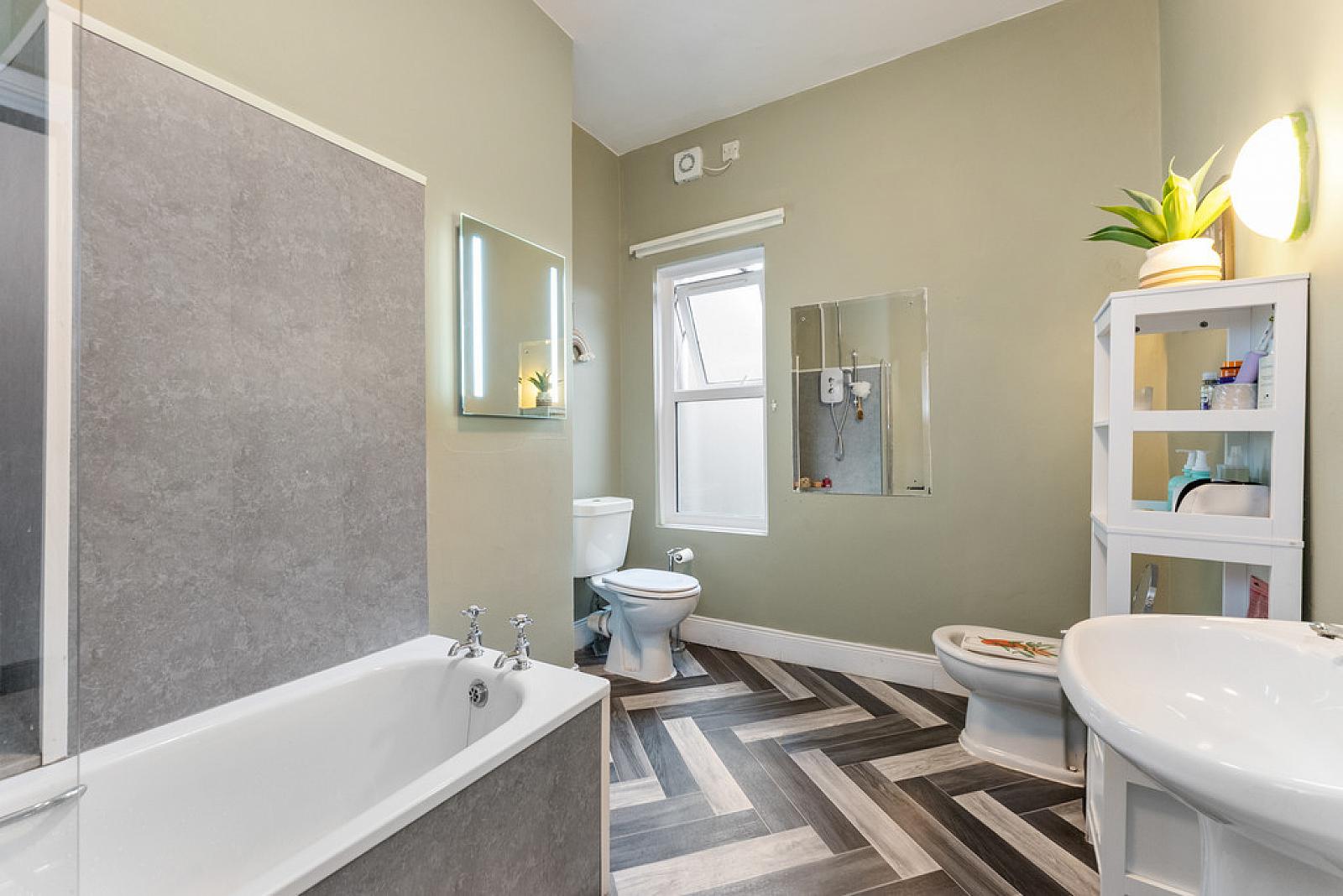 BATHROOM White suite comprising panelled bath with Redring shower over, panelled walls, low flush WC, bidet, pedestal wash hand basin with splash tiling, extractor fan.