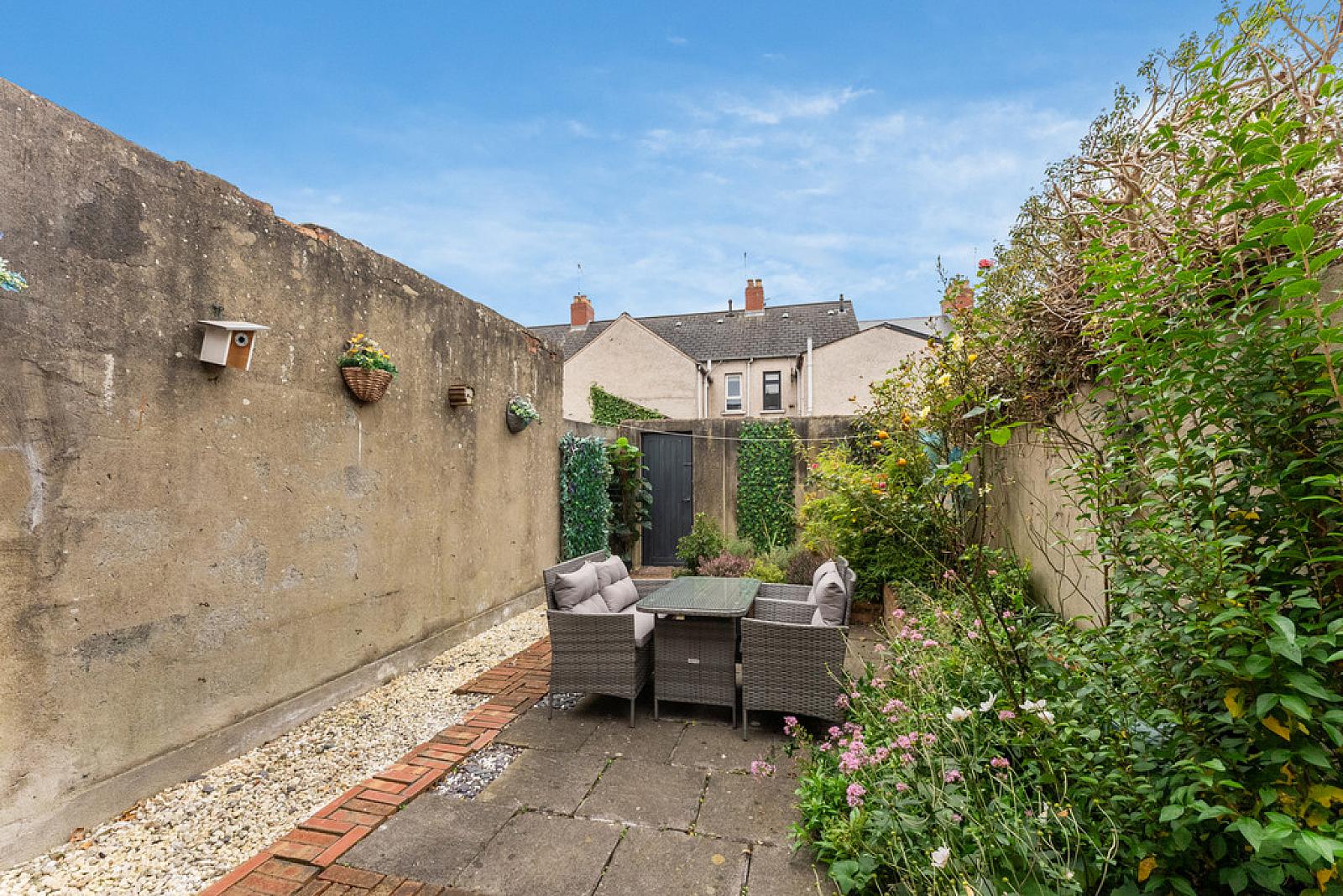 OUTSIDE Front forecourt with loose stones, paved path to front door. Delightful enclosed and private southerly aspect paved rear garden sitting area with planting.