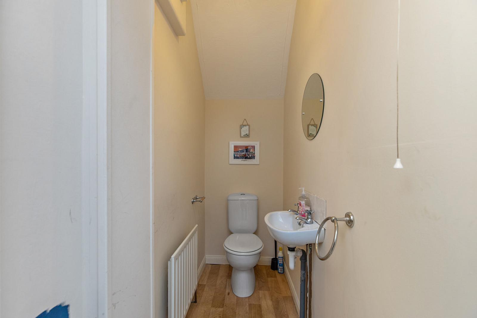 DOWNSTAIRS W.C. White suite comprising: low flush WC, wash hand basin, tiled splashback, extractor fan.