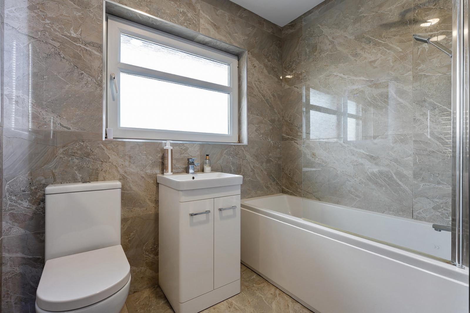 BATHROOM Fully tiled bathroom suite with panelled bath with mixer taps and thermostatic overhead shower unit. Wall mounted vanity sink unit. Low flush wc. Heated towel radiator. Extractor fan. Tiled floor.