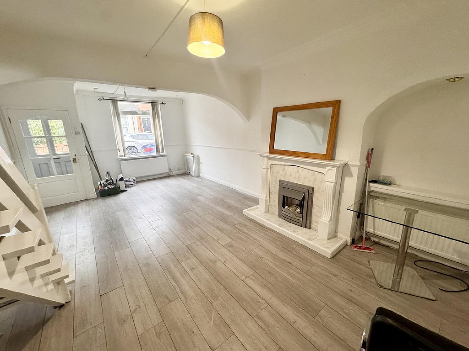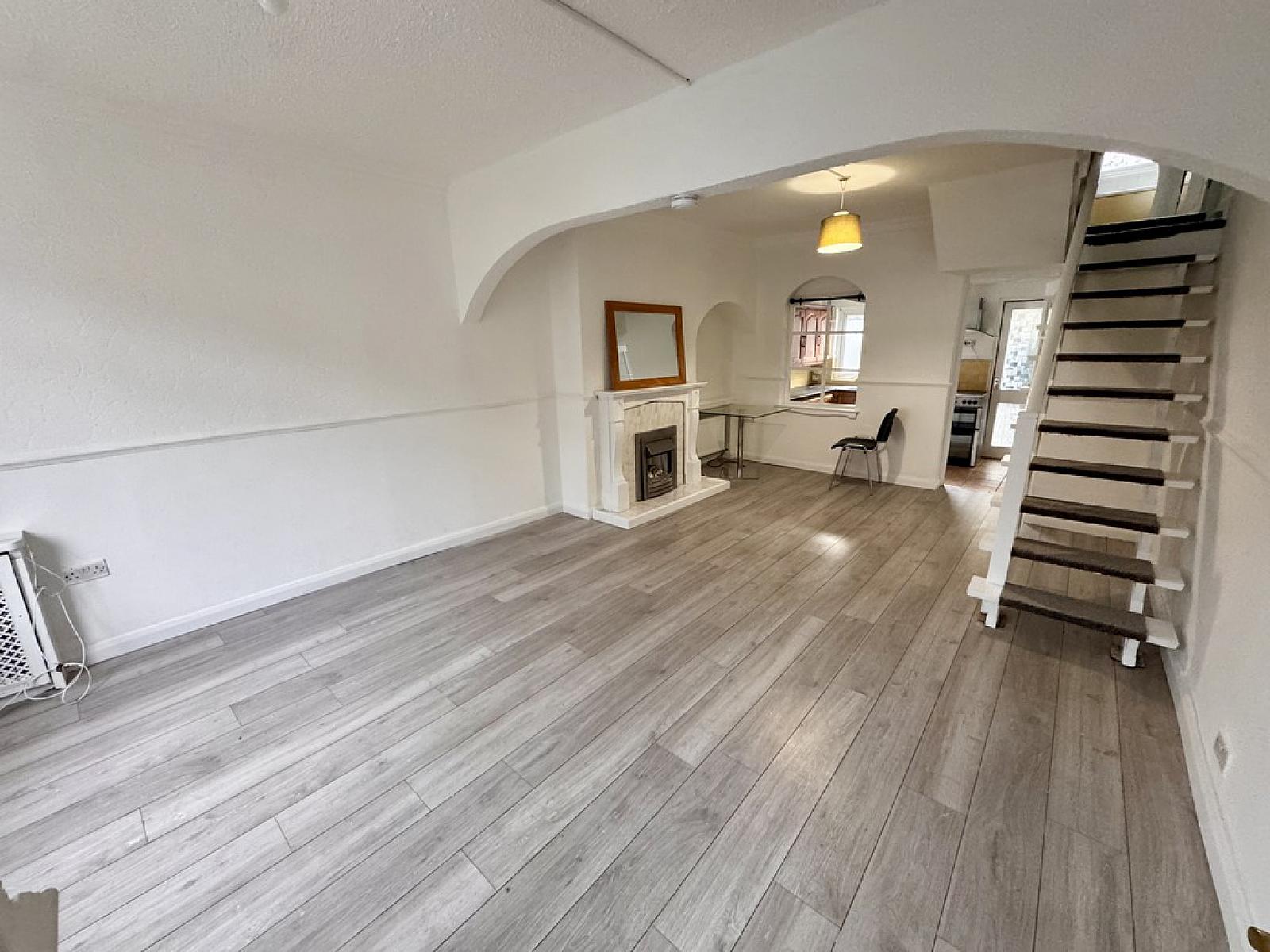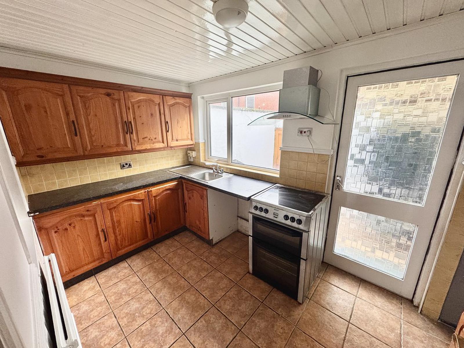 Internally, the home comprises a small entrance porch leading into a spacious open-plan living and dining area, complete with an under-stairs storage cupboard. To the rear, the kitchen features both high and low-level units, a standalone cooker, and an extractor fan.