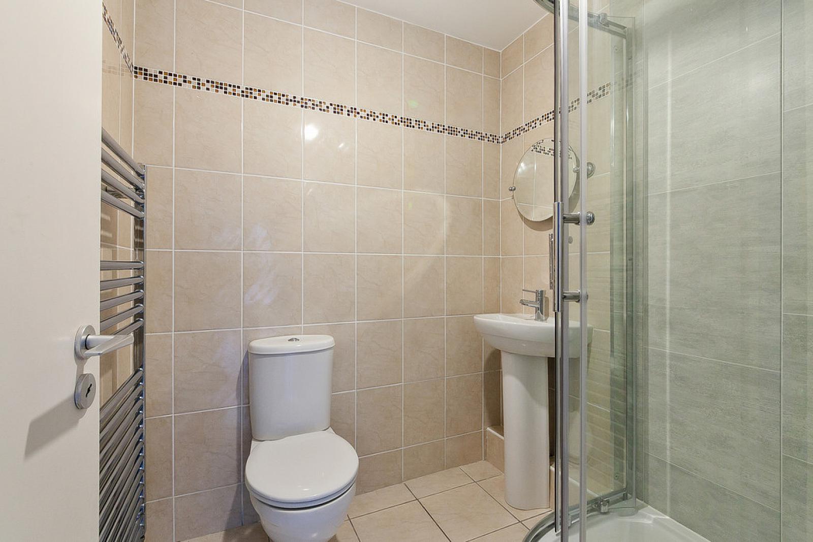 ENSUITE SHOWER ROOM White suite comprising pedestal wash hand basin, low flush WC, panelled shower cubicle, part tiled walls, tiled floor, extractor fan.