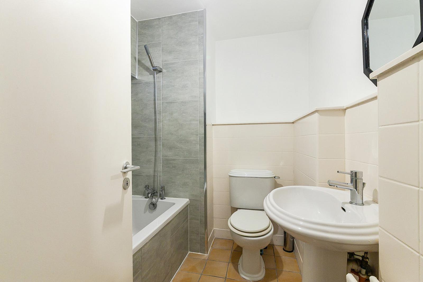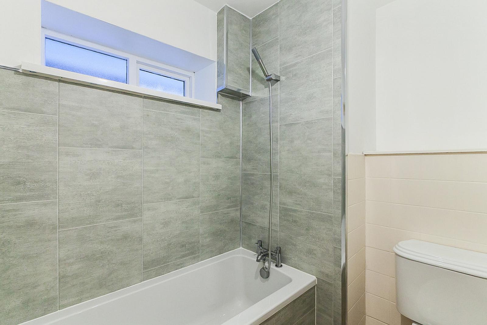 BATHROOM White suite comprising, low flush WC, pedestal wash hand basin, panelled bath with mixer tap and shower attachment, panelled walls, part tiled walls, tiled floor, extractor fan.