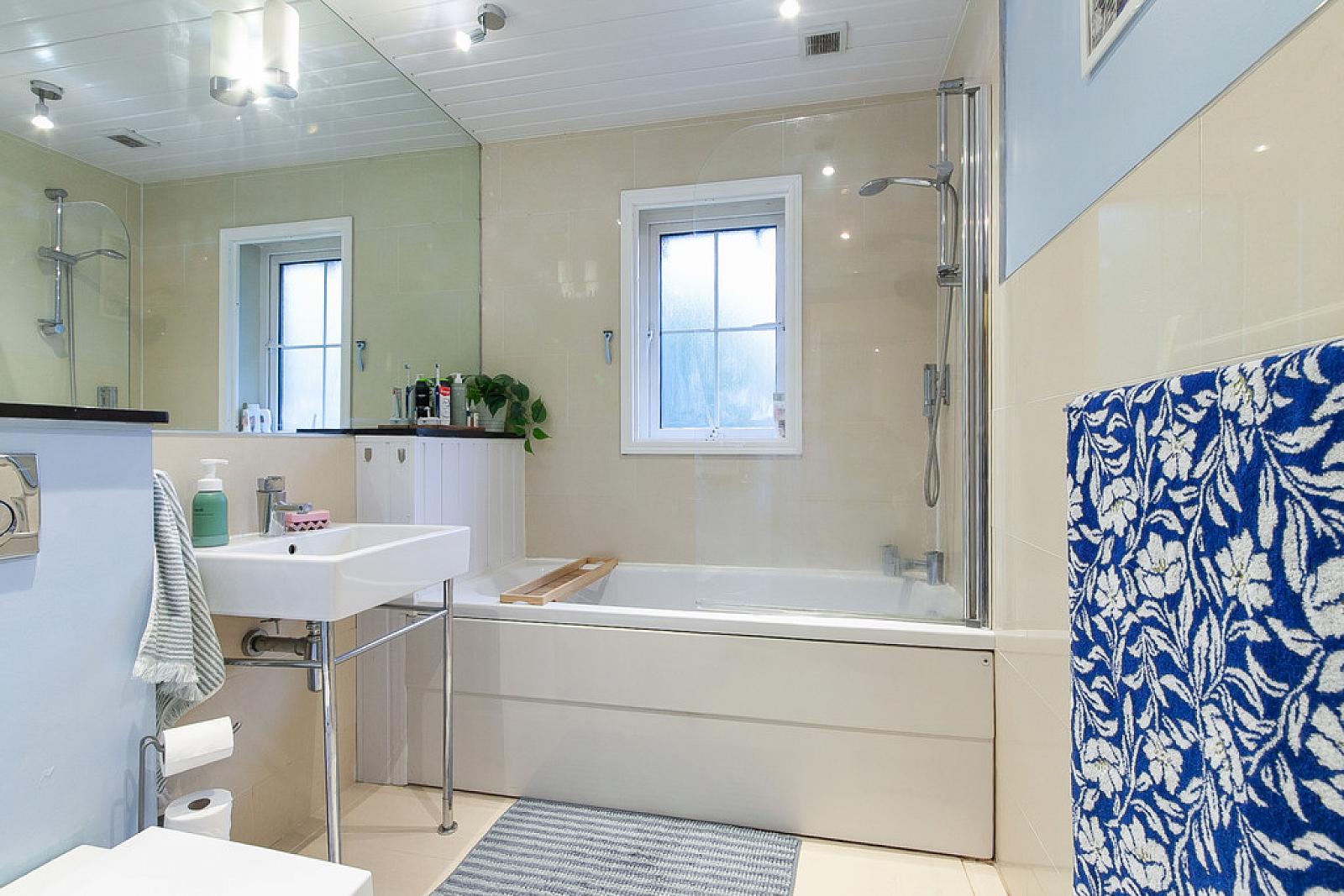 BATHROOM White suite comprising panelled bath with mixer tap and shower attachment, wash hand basin, low flush wc, chrome heated towel rail, part tiled walls, tiled floor, panelled ceiling with low voltage spots.