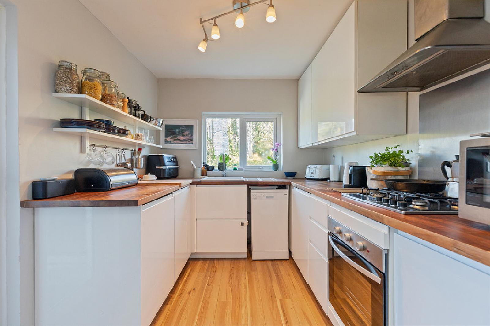 KITCHEN 9' 11" x 8' (3.02m x 2.44m) Range of high and low level units, wooden work surfaces, sink unit with mixer tap, four ring gas hob with stainless steel splash back, extractor fan over, electric oven under, plumbed for dishwasher, integrated fridge, integrated freezer, glazed door to rear, wood flooring.