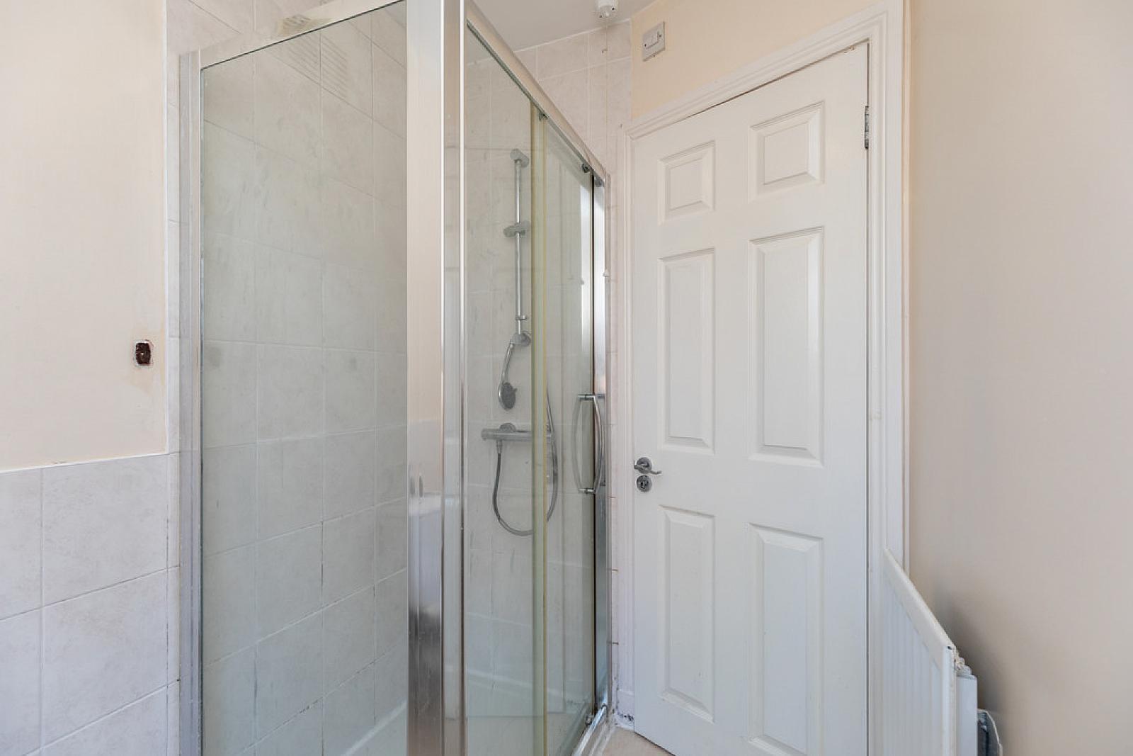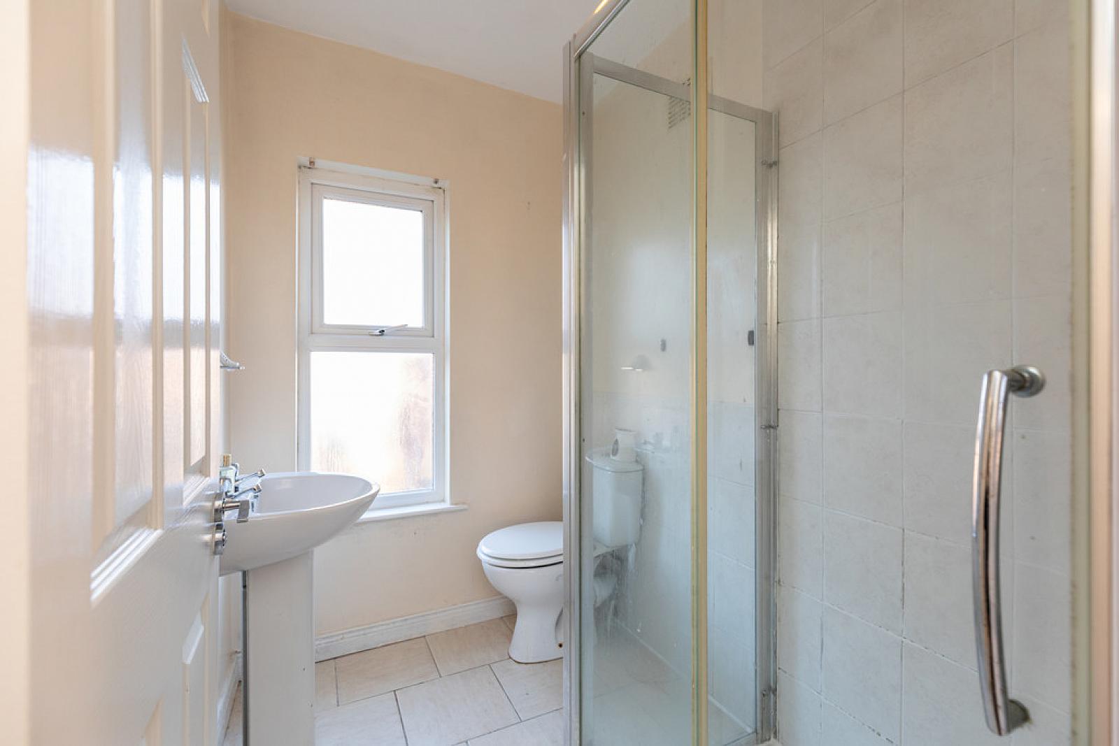 SHOWER ROOM White suite comprising pedestal wash hand basin, low flush WC, full tiled shower cubicle, tiled floor.