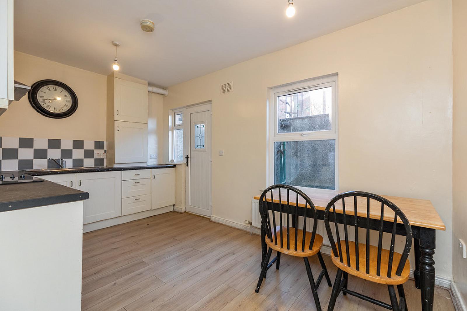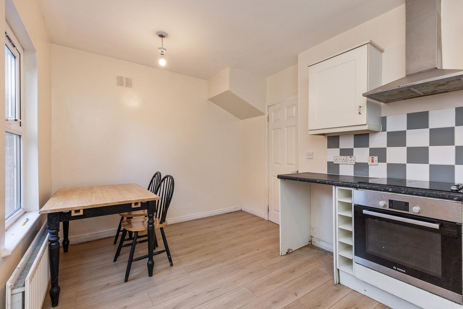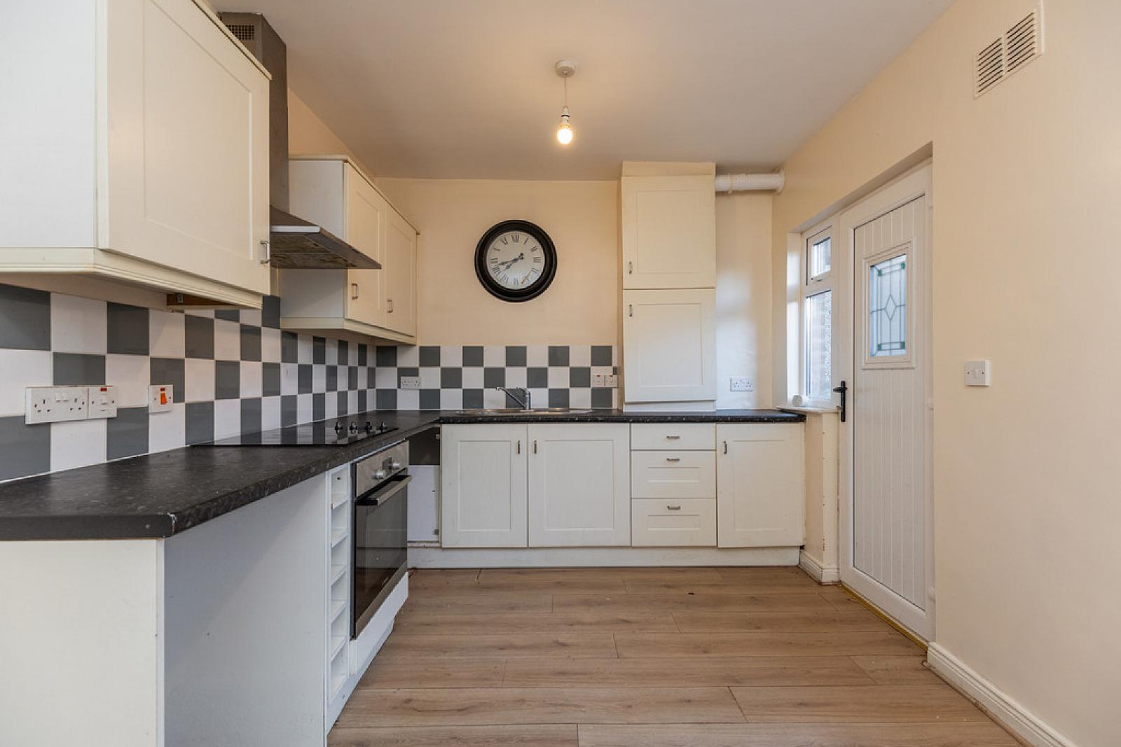 KITCHEN WITH DINING AREA 14' 6" x 9' 8" (4.42m x 2.95m) Range of high and low level units, work surfaces, single drainer stainless steel sink unit with mixer tap, four ring hob, electric oven under, part tiled walls, laminate wood effect floor, access to rear yard, concealed gas fired boiler.