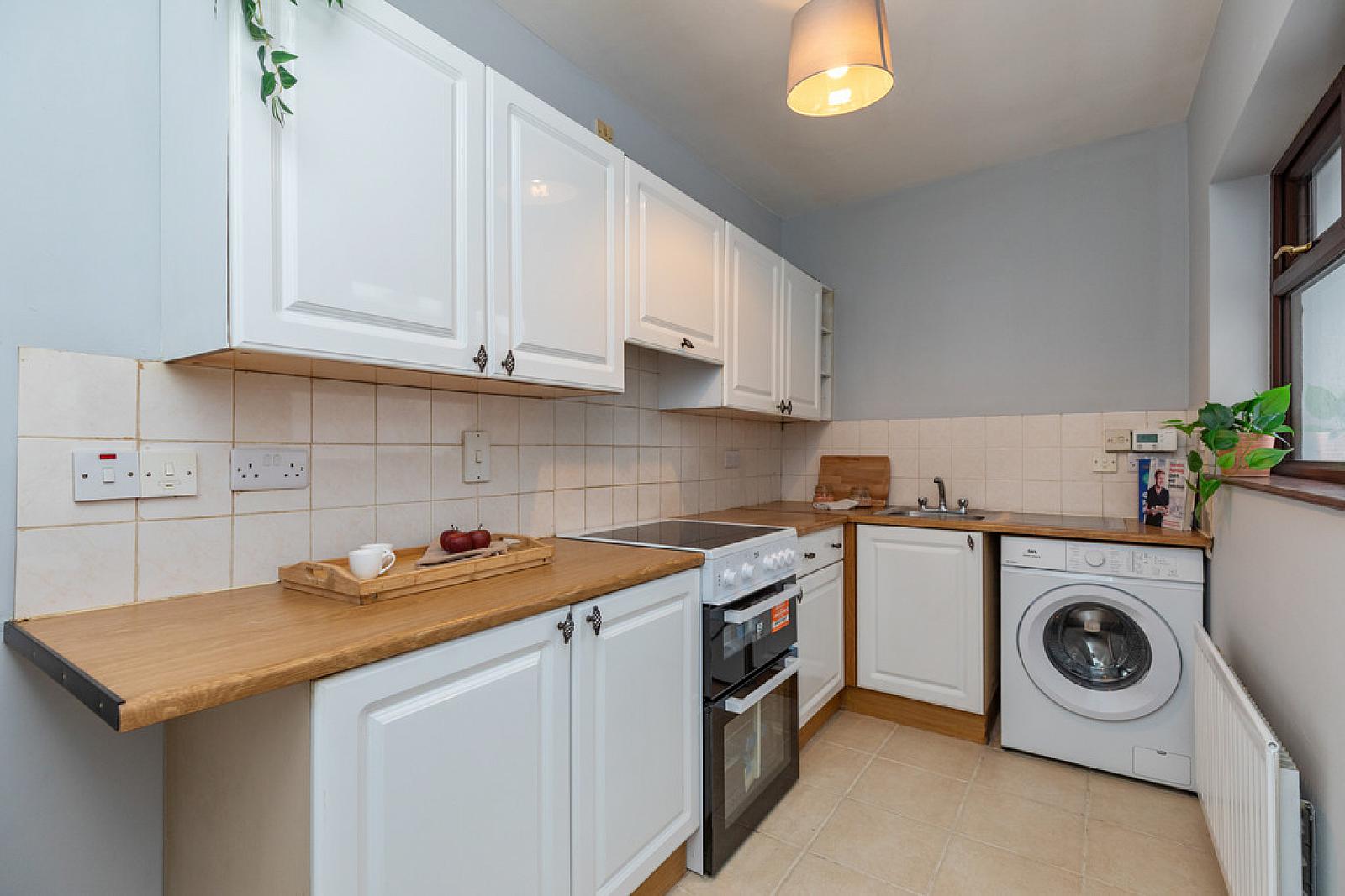 KITCHEN 12' 0" x 5' 11" (3.66m x 1.81m) Range of high and low level units, wood effect work surfaces, stainless steel sink unit, space for oven and hob, space for fridge freezer, plumbed for washing machine, partly tiled walls, tiled floor.