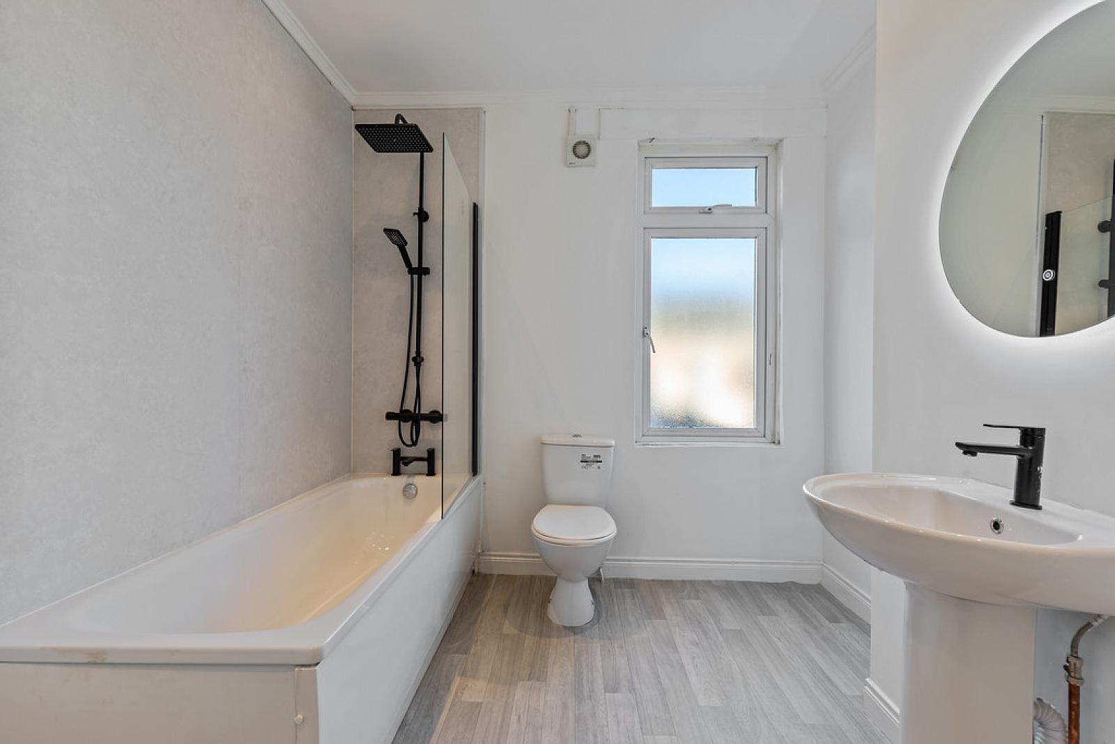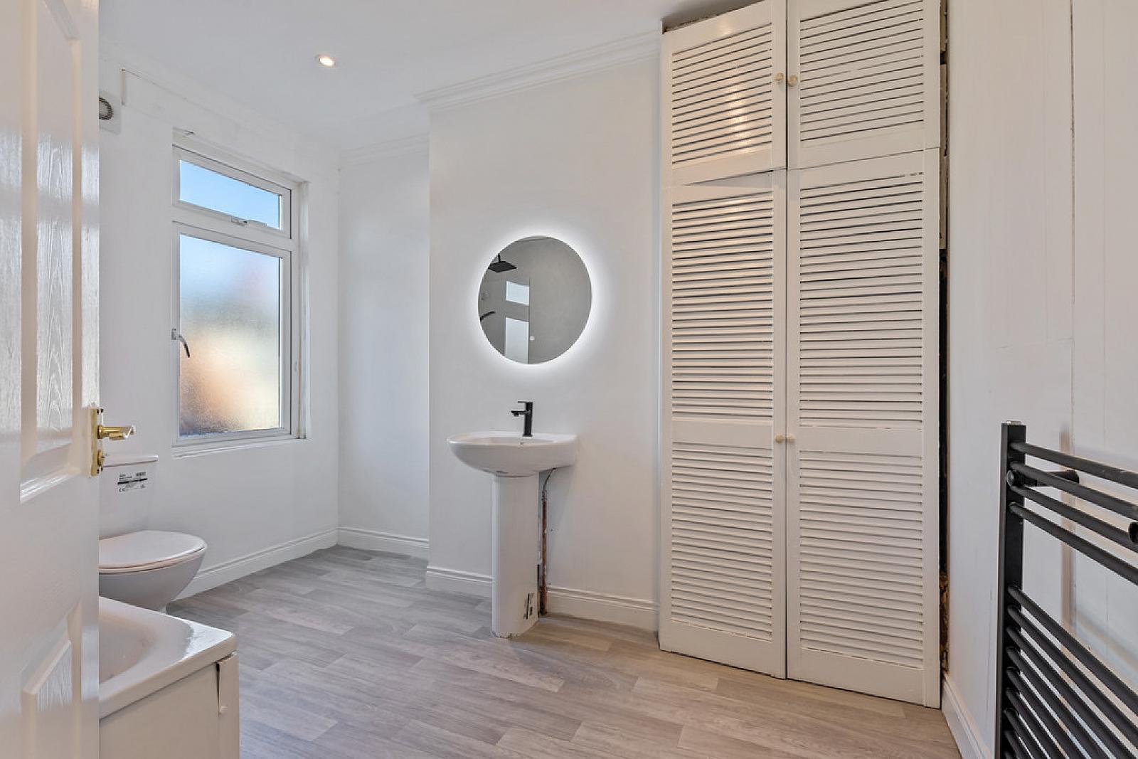 BATHROOM White suite comprising of a panel bath with drench style shower, pedestal wash hand basin with LED mirror over, low flush w.c, heated towel radiator, partially panelled walls, storage cupboard, spot lighting.