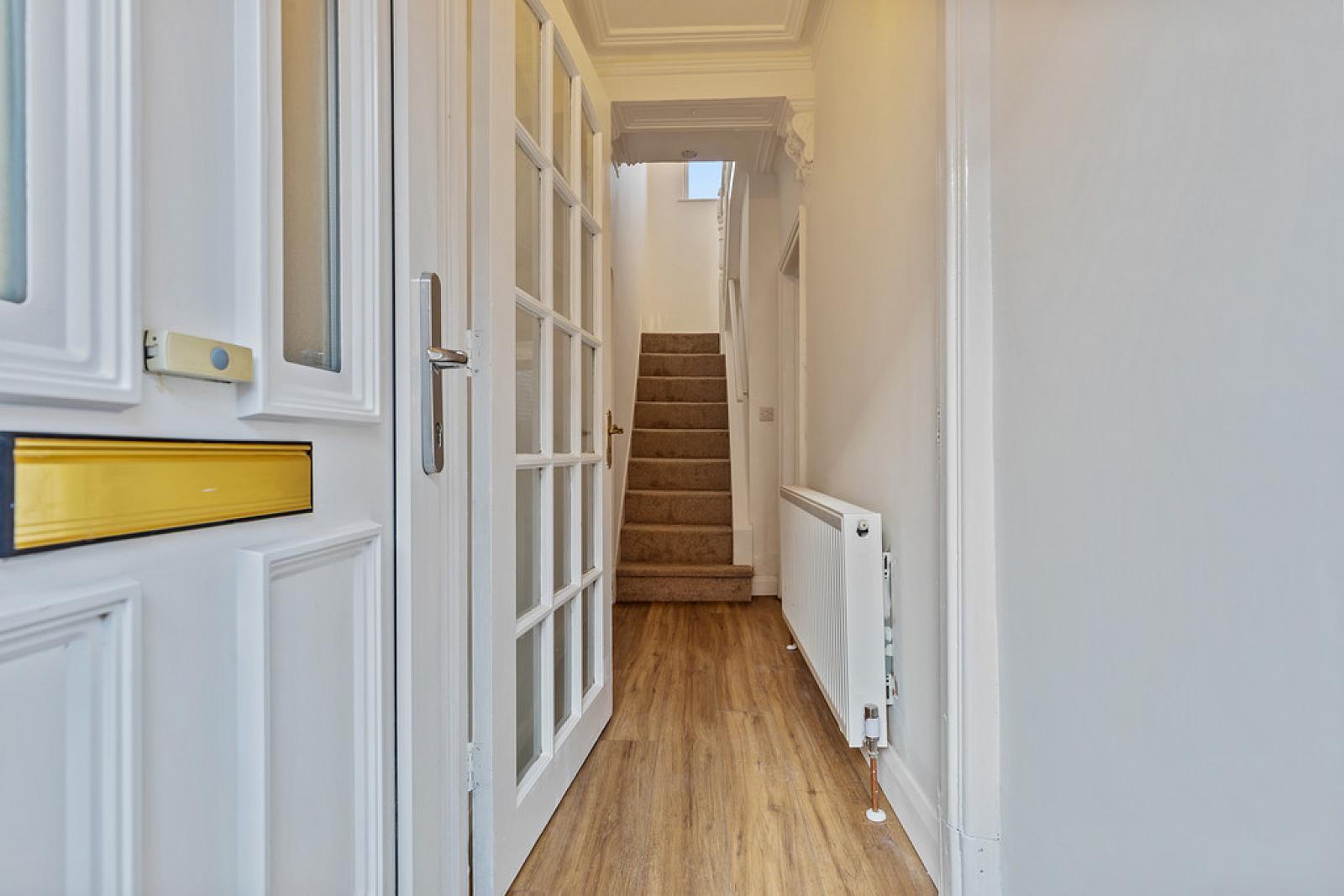 ENTRANCE HALL Wood strip flooring, cornicing.