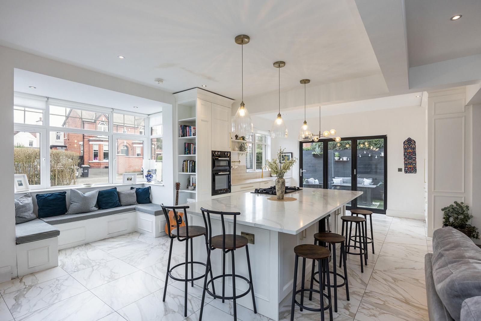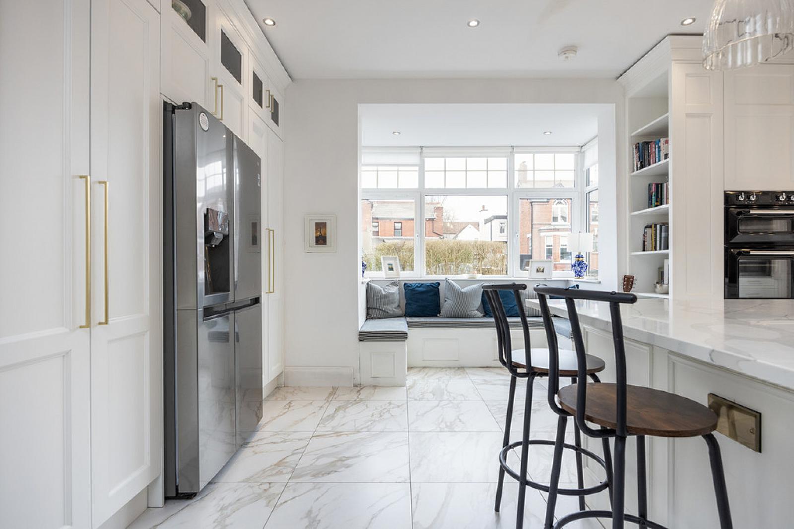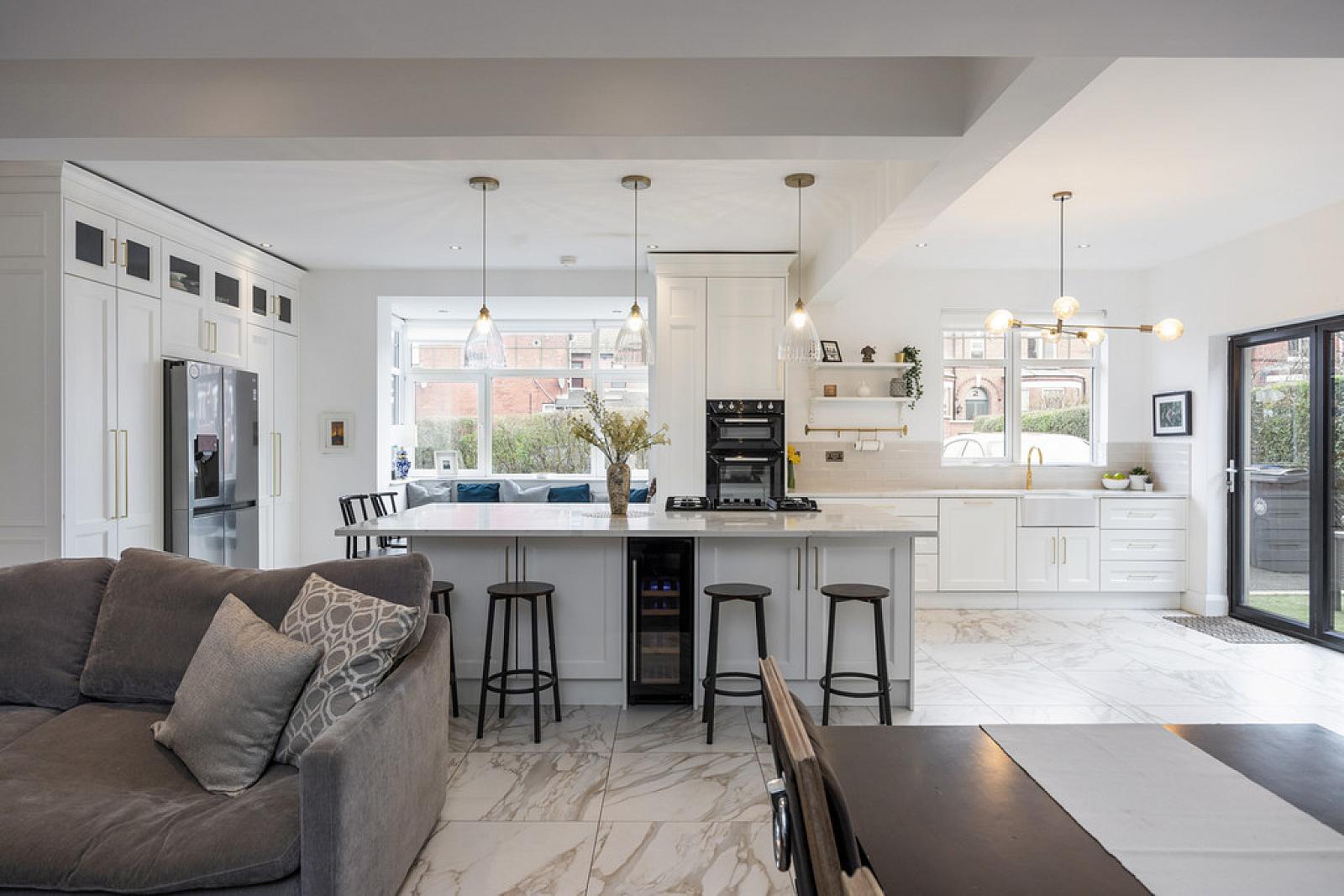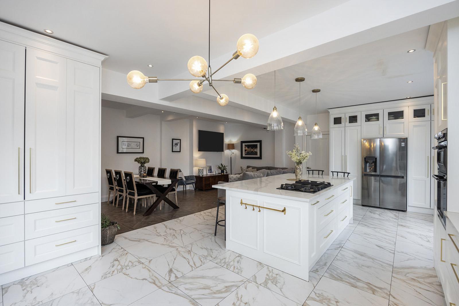 MAGNIFICIANT LUXURY FITTED KITCHEN OPEN PLAN TO DINING AND FAMILY AREAS 27' 5" x 25' 4" (8.36m x 7.72m) (overall) Bespoke range of high and low level units, Calcutta marble work surfaces, Smeg eye level double oven, Old Belfast style sink unit with Quooker tap and Calcutta marble drainer, integrated dishwasher, larder cupboard with folding doors, housing for American fridge freezer, generous island unit with matching Calcutta marble work surfaces, Elica 4 ring gas hob with central extractor fan, breakfast bar, low voltage spotlights, bay window with seating, part tiled walls, marble tiled floor to kitchen area, tiled floor with parquet wood design to family and dining areas, bi-folding doors to sheltered sitting area.