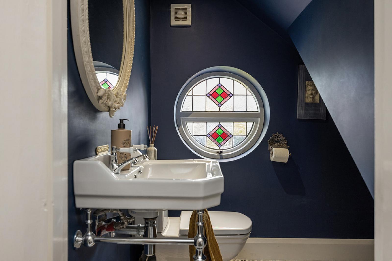 CLOAKROOM White suite comprising low flush WC, wash hand basin, feature circular stained glass window and tiled floor.