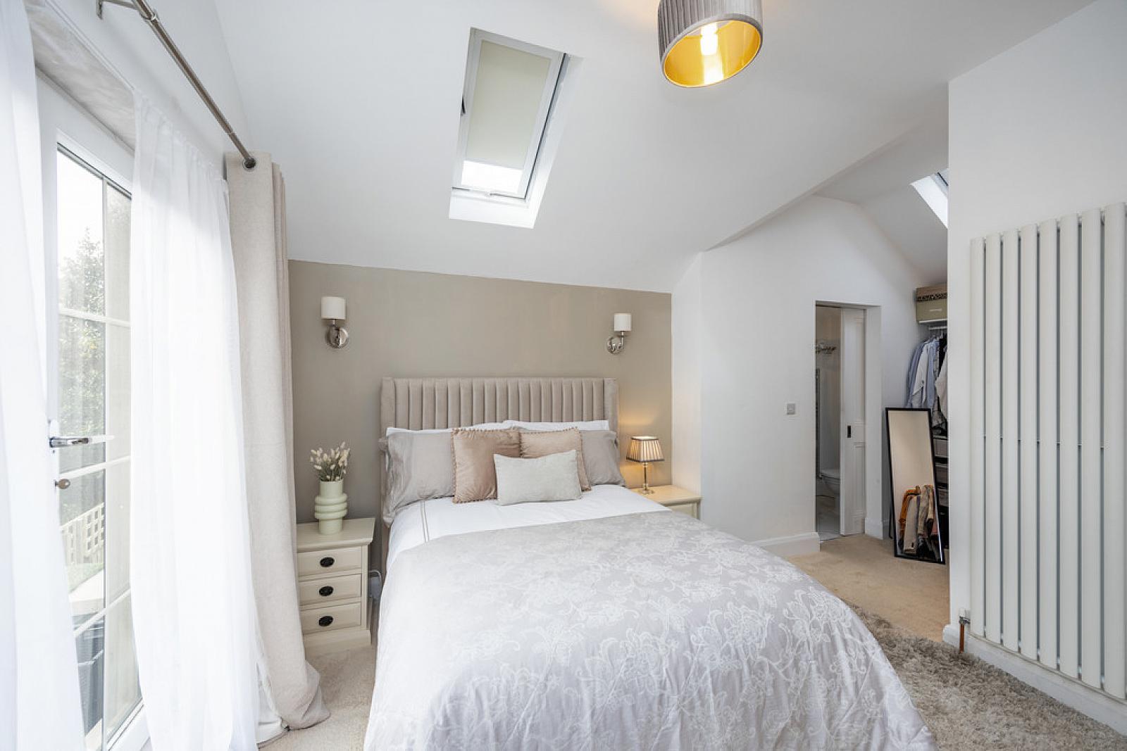 BEDROOM 17' 5" x 11' 2" (5.31m x 3.4m) (overall at widest points) Two Velux windows, uPVC double glazed patio doors to half balcony.