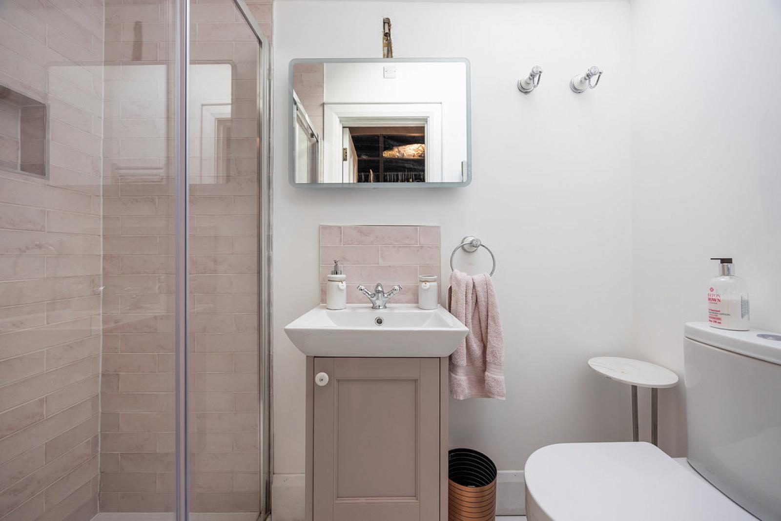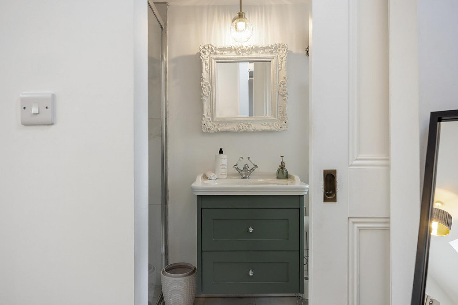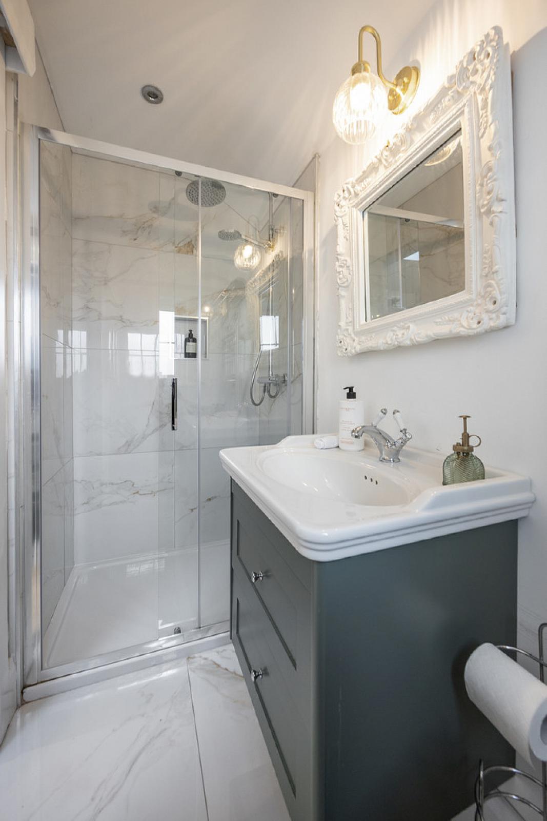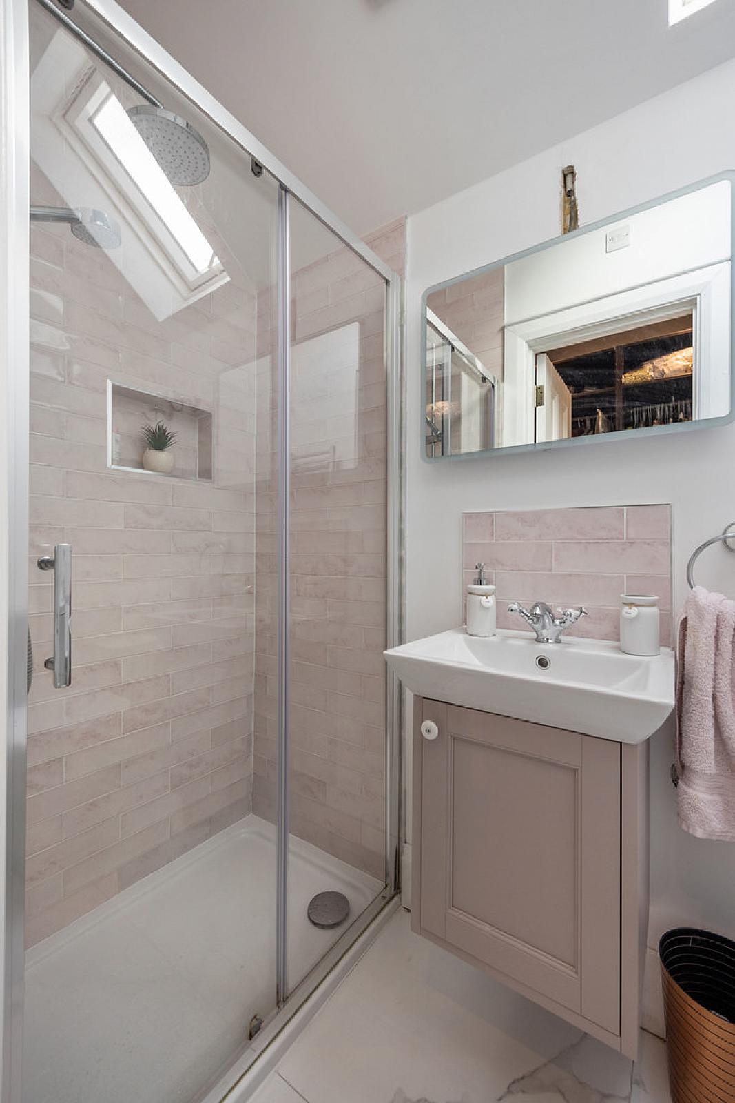 ENSUITE SHOWER ROOM White suite comprising vanity unit with splash tiling, low flush WC, fully tiled shower cubicle with rainwater shower, low voltage spotlights, extractor fan, Velux window, Calcutta marble tiled floor, chrome heated towel rail.