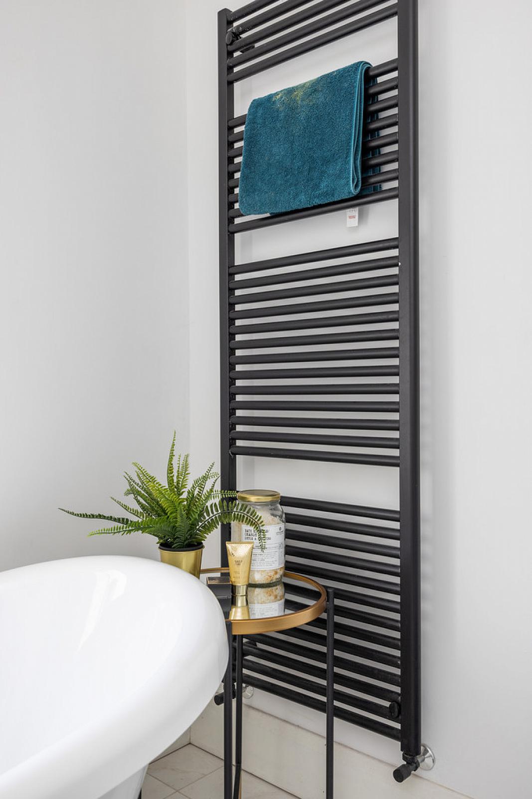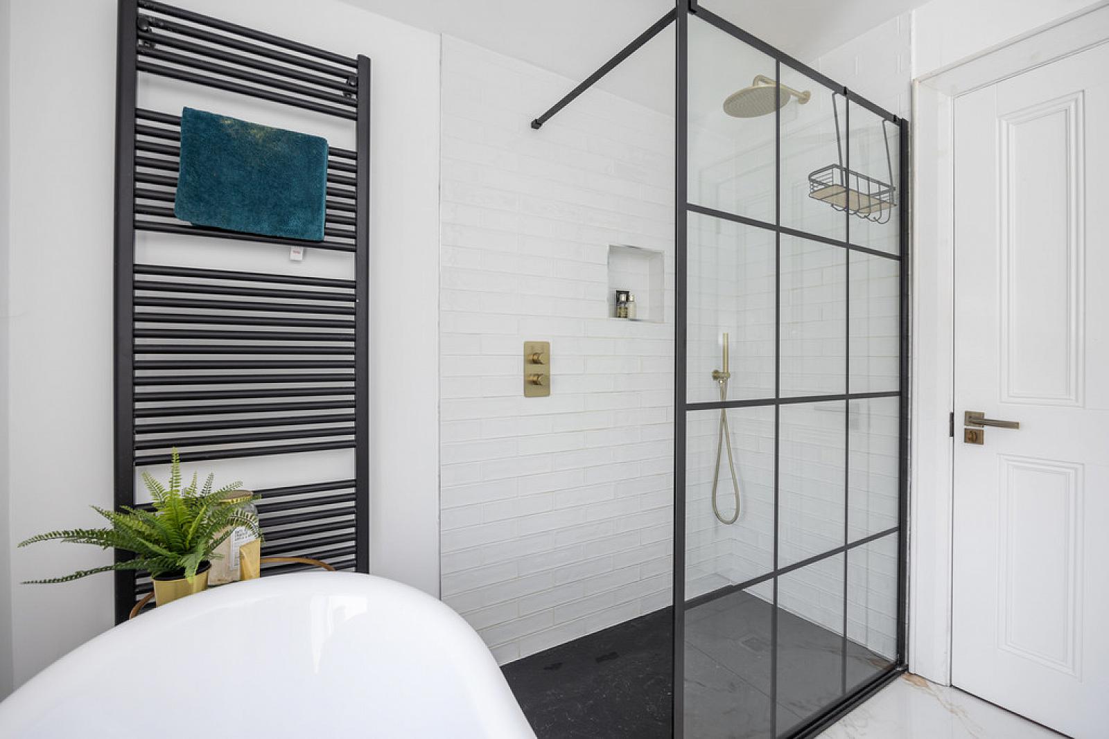 BATHROOM White suite comprising free standing bath with mixer taps and shower attachment, vanity unit with mixer tap, storage, Calcutta marble surfaces, low flush WC, walk in shower cubicle with rainwater shower, heated towel rail, Calcutta marble tiled floor, low voltage spotlights, extractor fan.