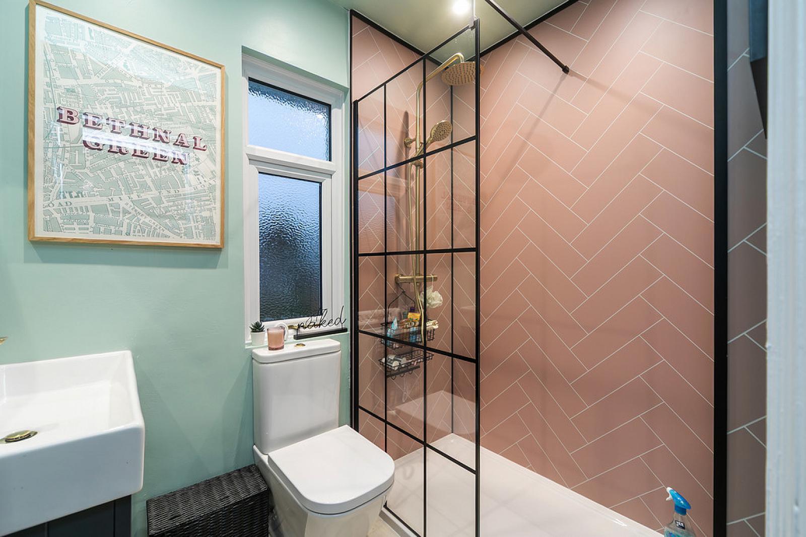 SHOWER ROOM White suite comprising vanity unit with storage, panelled splash back, low flush WC, walk in panelled shower cubicle with rainwater shower, heated towel rail, low voltage spotlights, access to roof space.