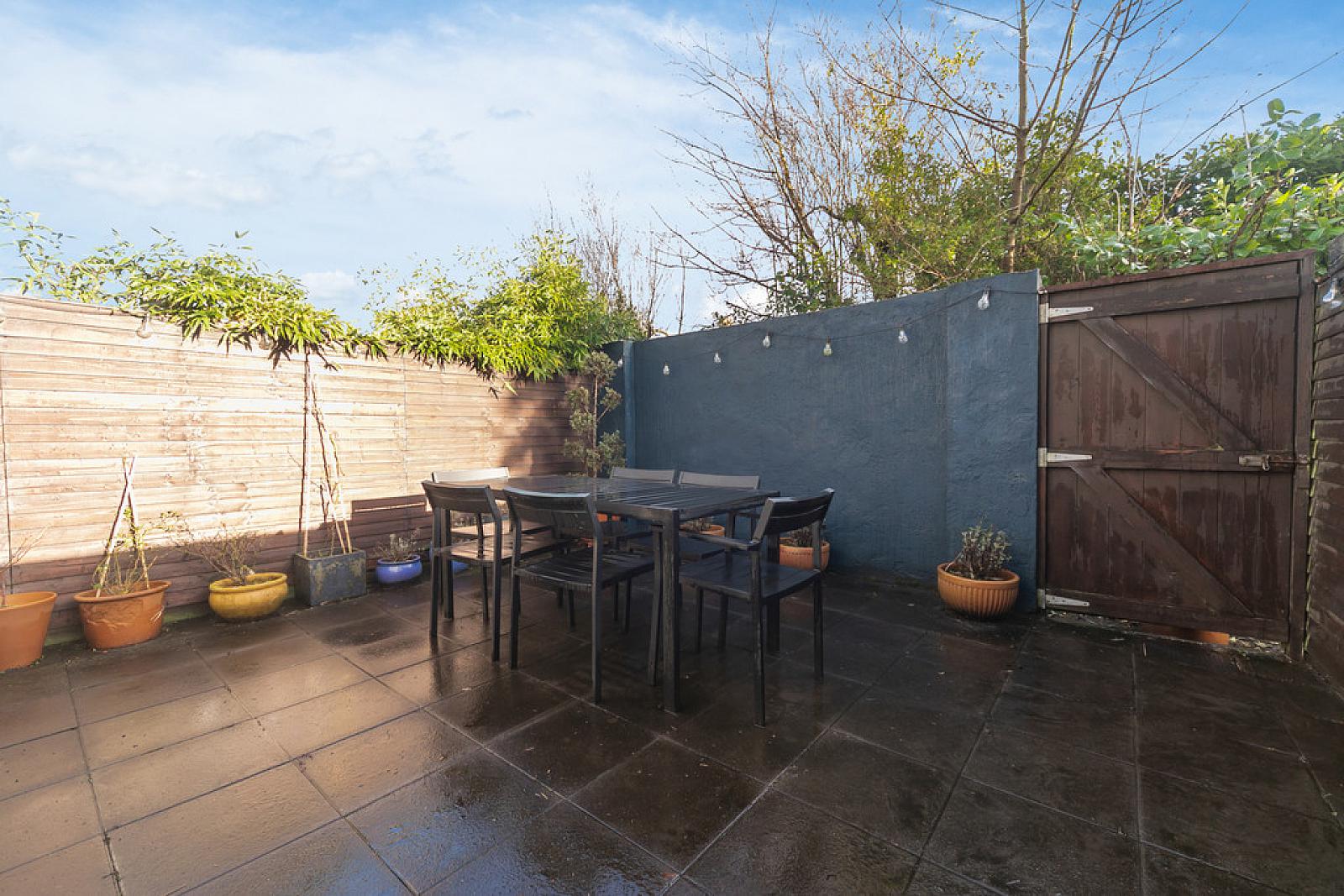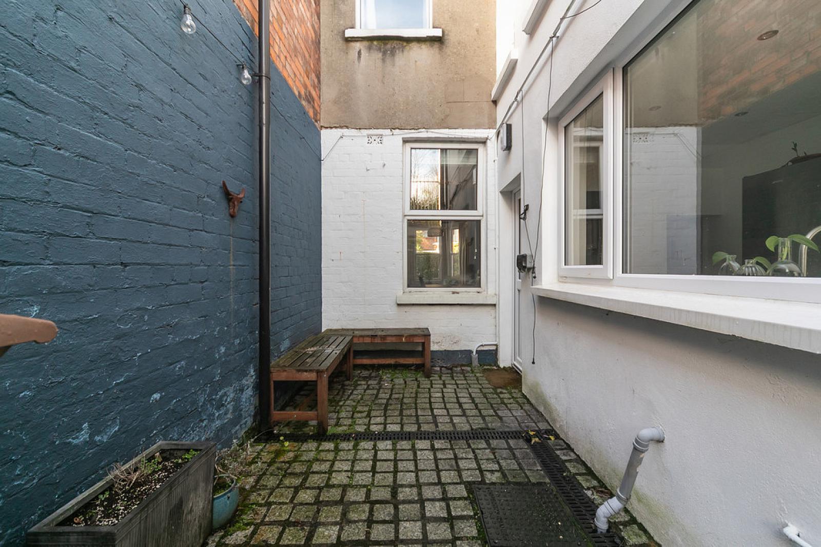 Private, enclosed paved rear garden, timber fencing, outside light.