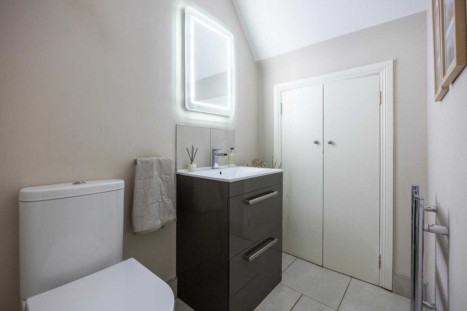 DOWNSTAIRS W.C Wash hand basin with chrome taps and tiled splash back with storage under, low flush w.c, heated chrome towel radiator, tiled floor, under stair storage cupboard.