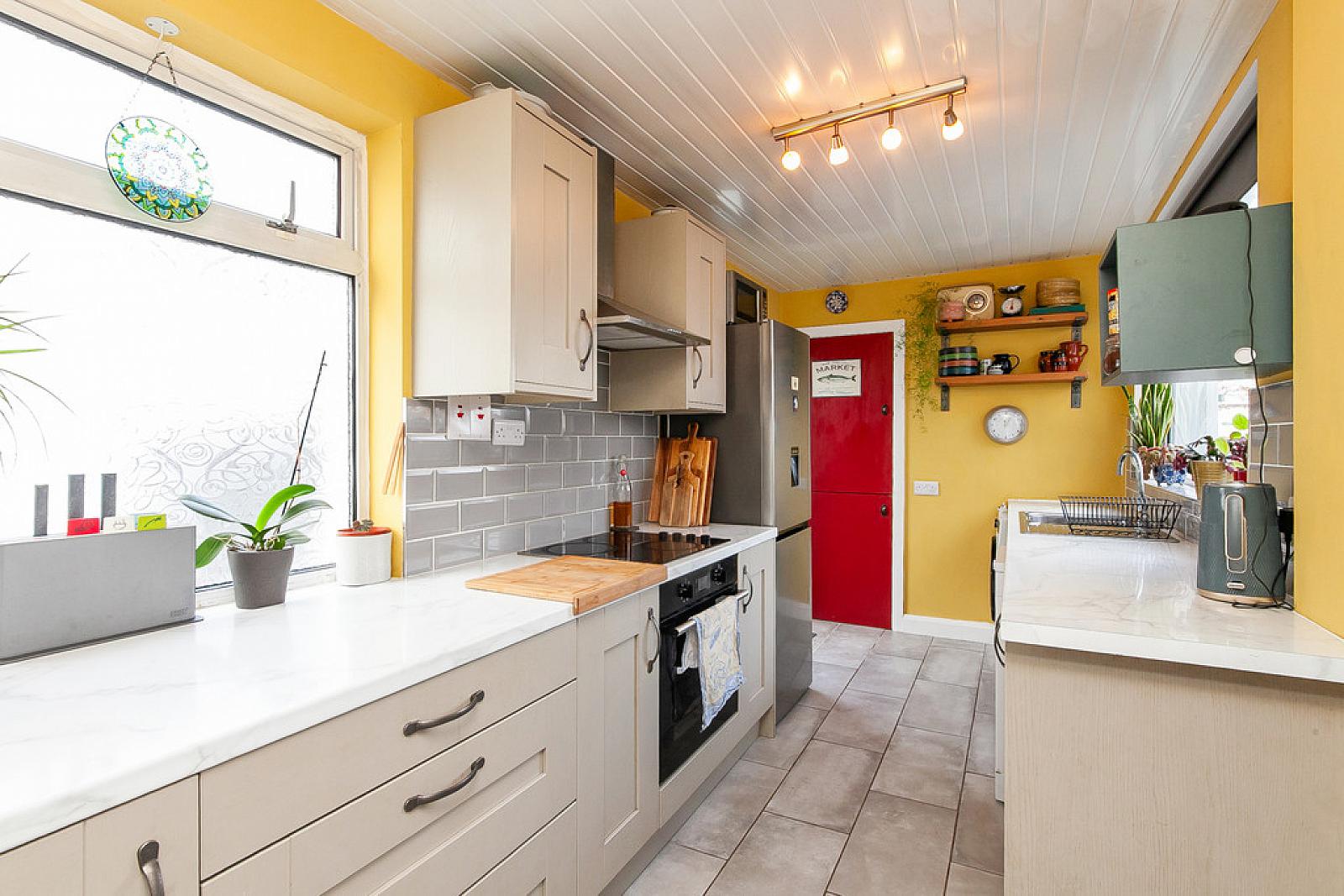 KITCHEN (OPEN TO DINING ROOM) 15' 1" x 6' 9" (4.62m x 2.06m) Kitchen - excellent range of high and low level units with chrome handles, formica work surfaces, stainless steel sink unit, integrated oven and four ring hob with chrome extractor fan over, space for fridge freezer, plumbed for dish washer, plumbed for washing machine, tiled floor, partly tiled walls, tongue and groove ceiling