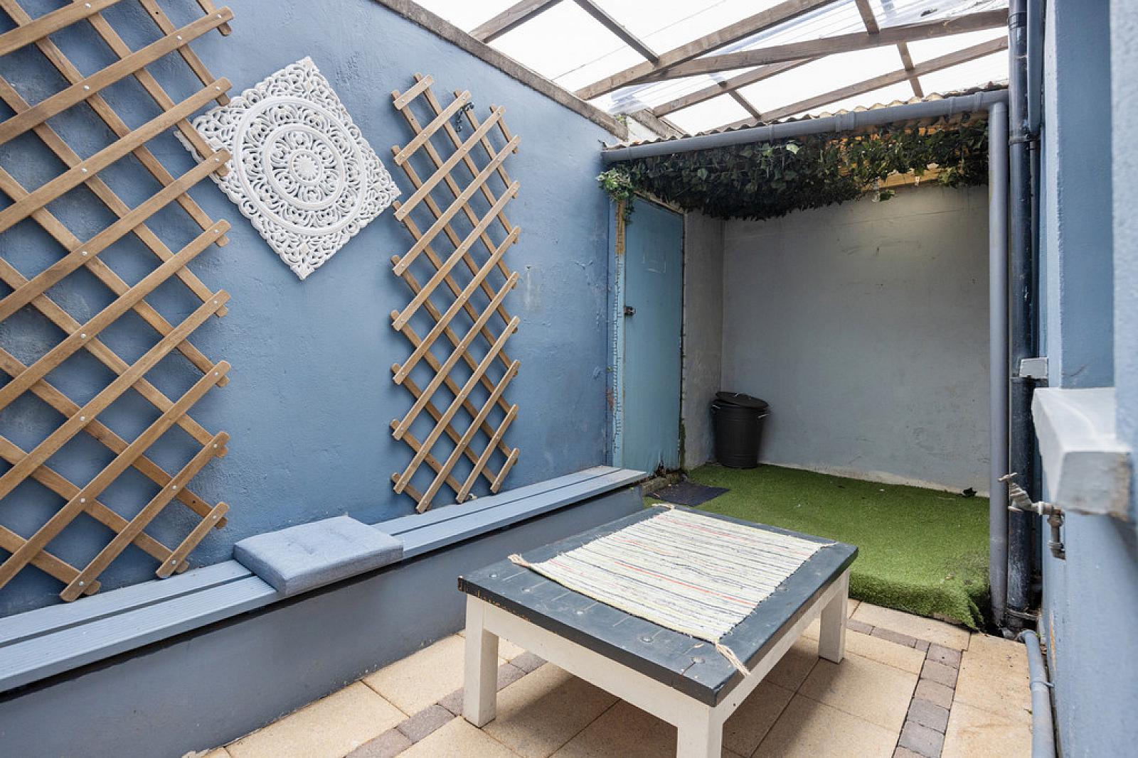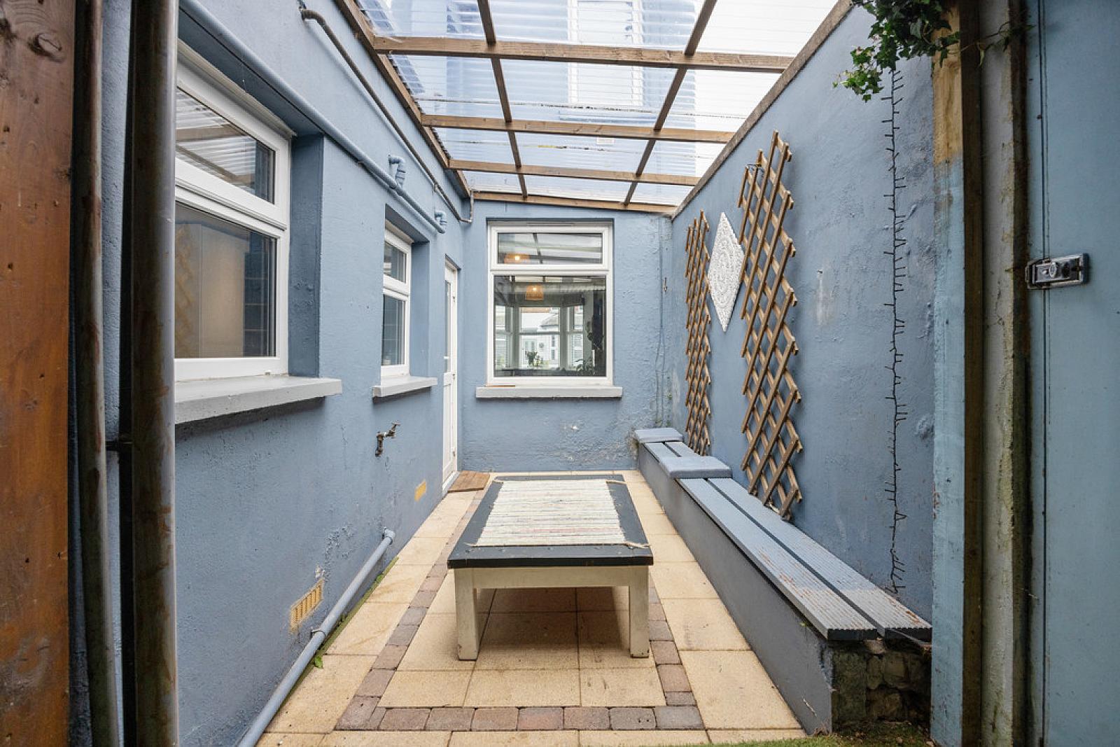 OUTSIDE Enclosed rear courtyard. Covered paving and seating area. Outside tap. Utility store.