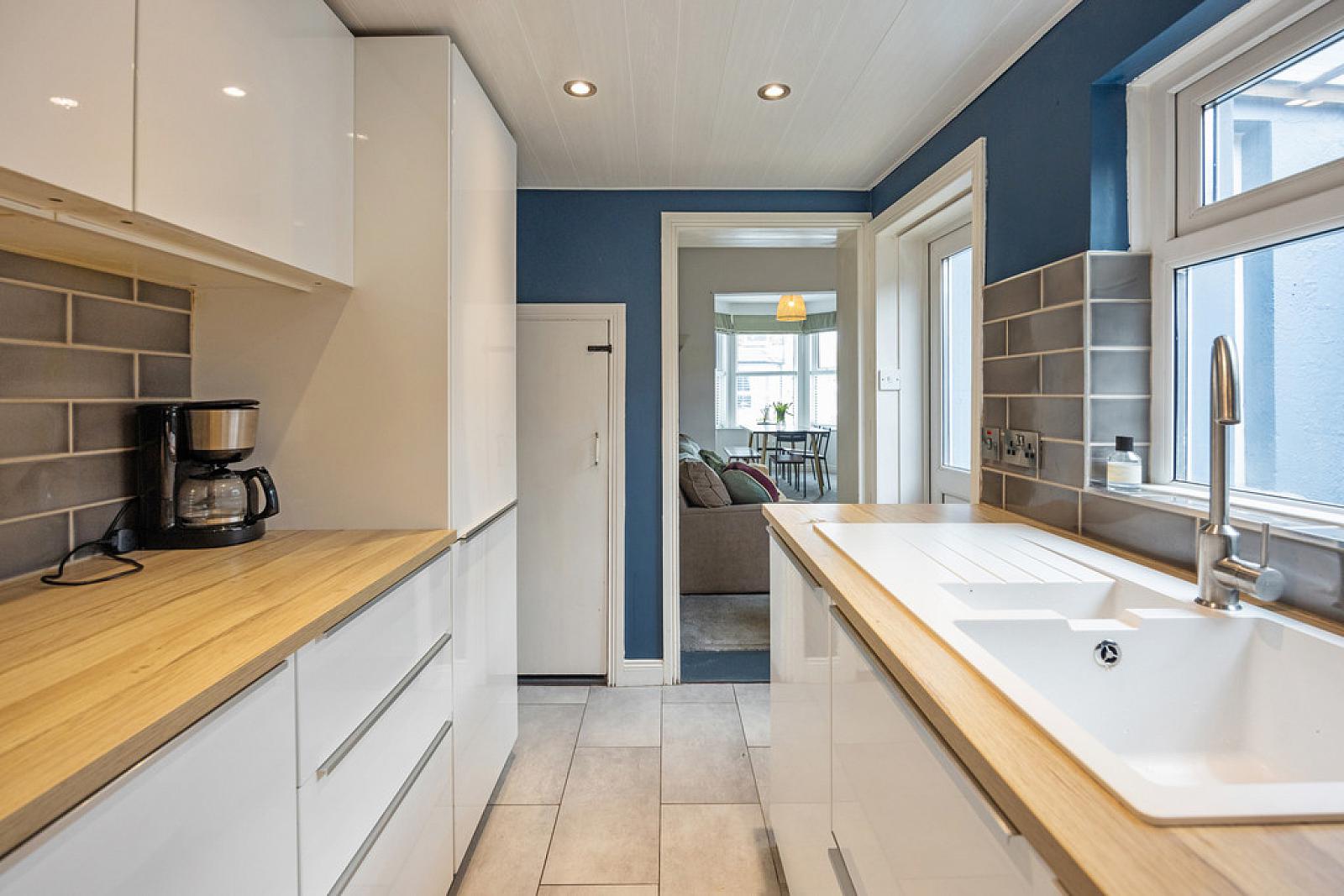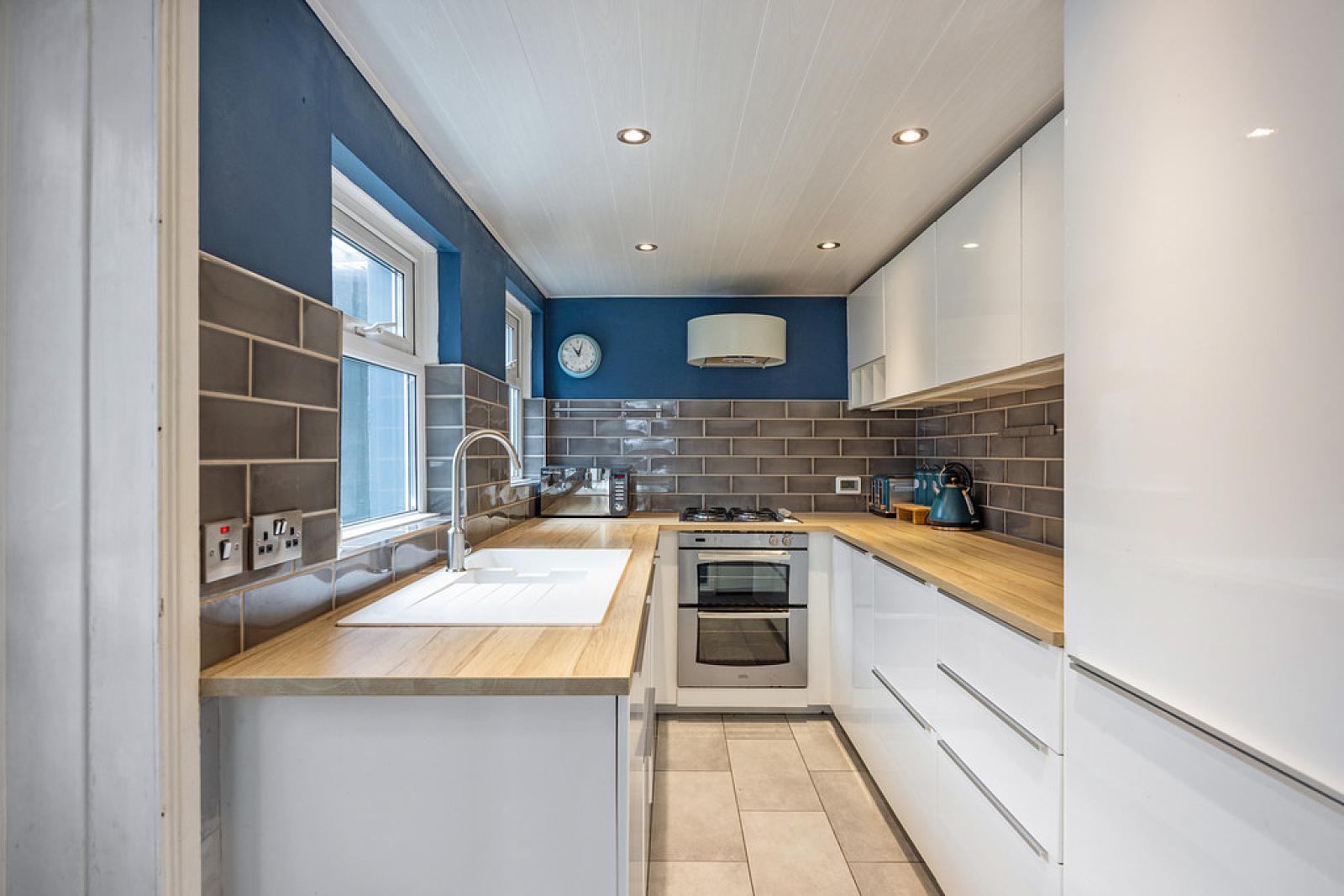 KITCHEN 12' 1" x 6' 7" (3.70m x 2.01m) Excellent range of high and low level high gloss units with wood effect worktops. Sink unit with mixer tap. Integrated under oven. Integrated four ring gas hob. Extractor hood. Integrated fridge freezer. Integrated dishwasher. Tiled floor. Recessed low voltage spot lights. Tongue and groove style uPVC ceiling. Access to under stair storage. Door to enclosed rear yard.