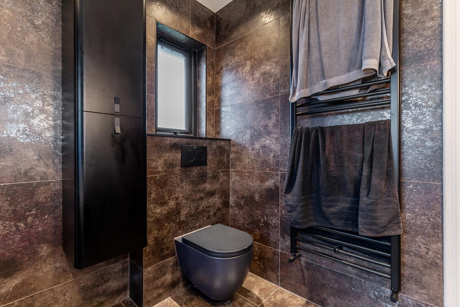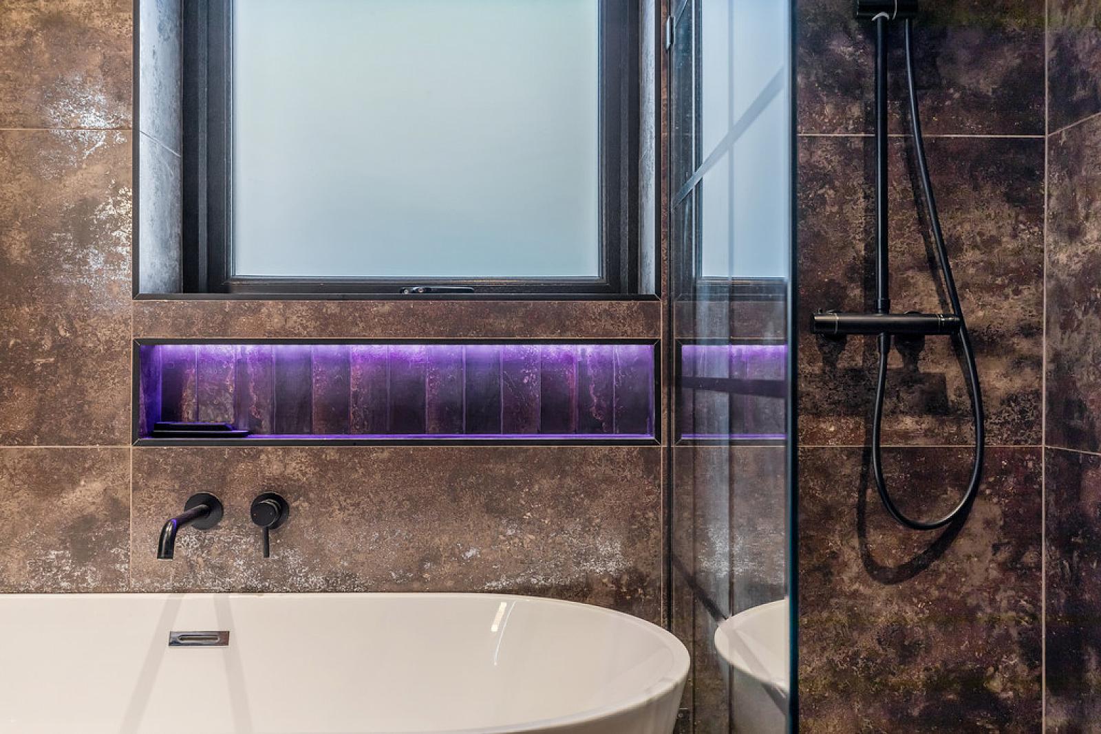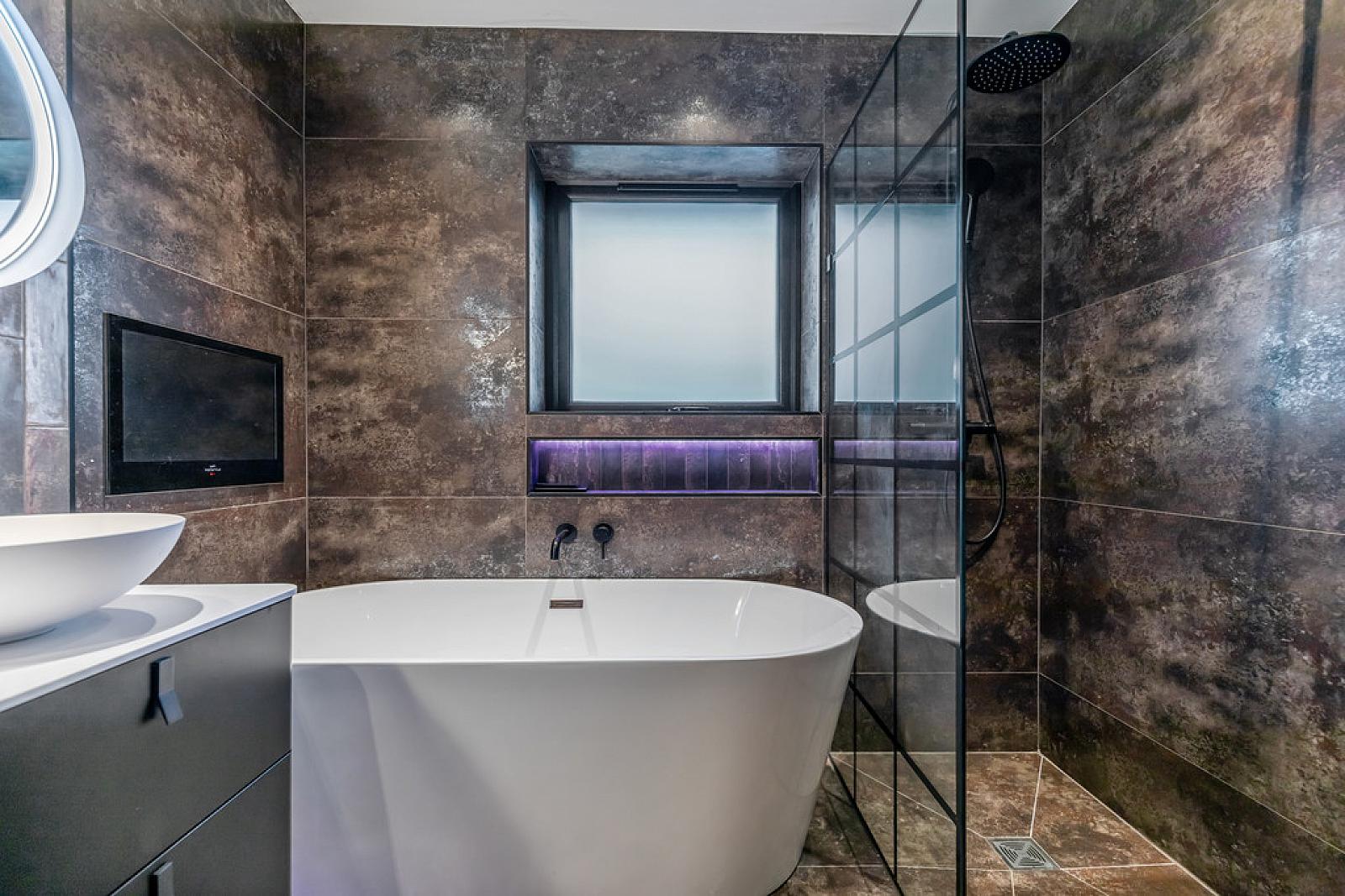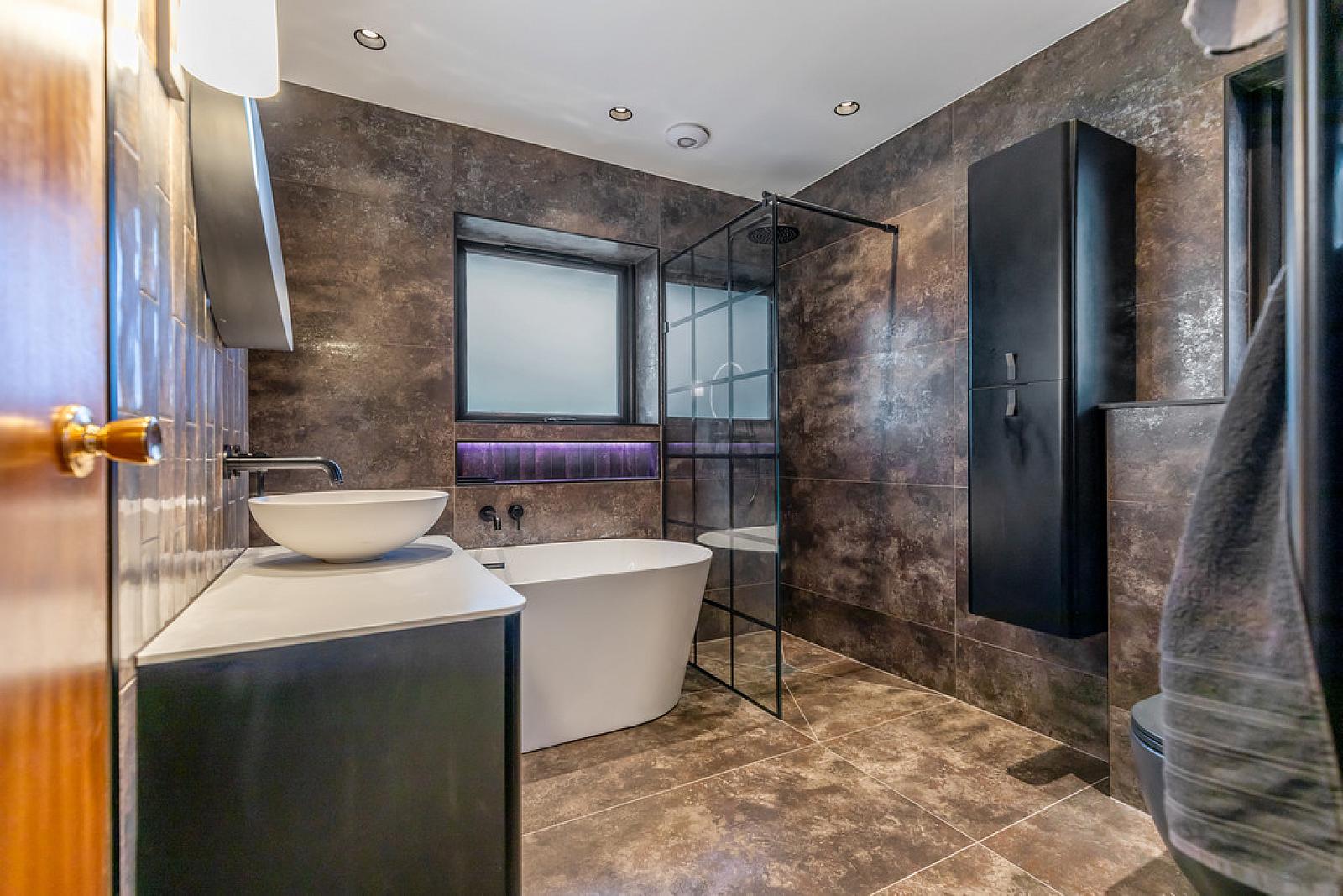 FAMILY BATHROOM Luxury suite comprising of a walk in shower cubicle with drench style shower, free standing bath with Watervue wall mounted television, soaps and remote recess, wall hung bowl wash hand basin with storage under, low flush w.c, vertical towel radiator, Chinese slate style floor and a wall tiling, spot lighting.