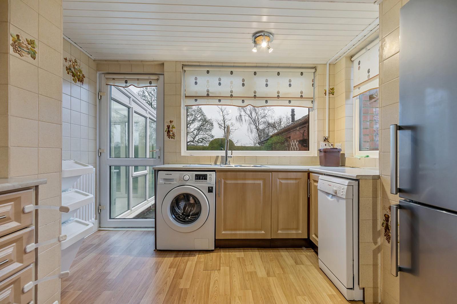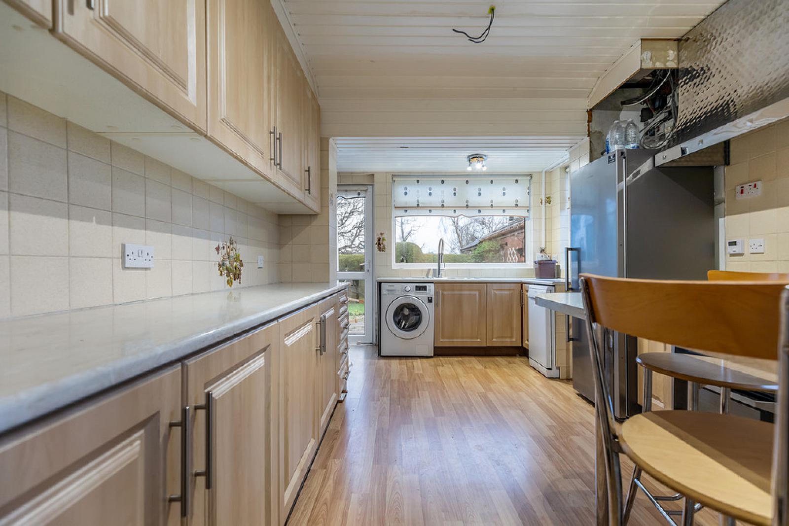 KITCHEN 14' 11" x 10' 6" (4.57m x 3.22m) Range of high and low level units with chrome handles, laminate work surfaces, stainless steel sink unit, space for oven and hob, stainless steel extractor fan, space for fridge freezer, plumbed for washing machine, plumbed for dishwasher, breakfast bar, tongue and groove ceiling, fully tiled walls.