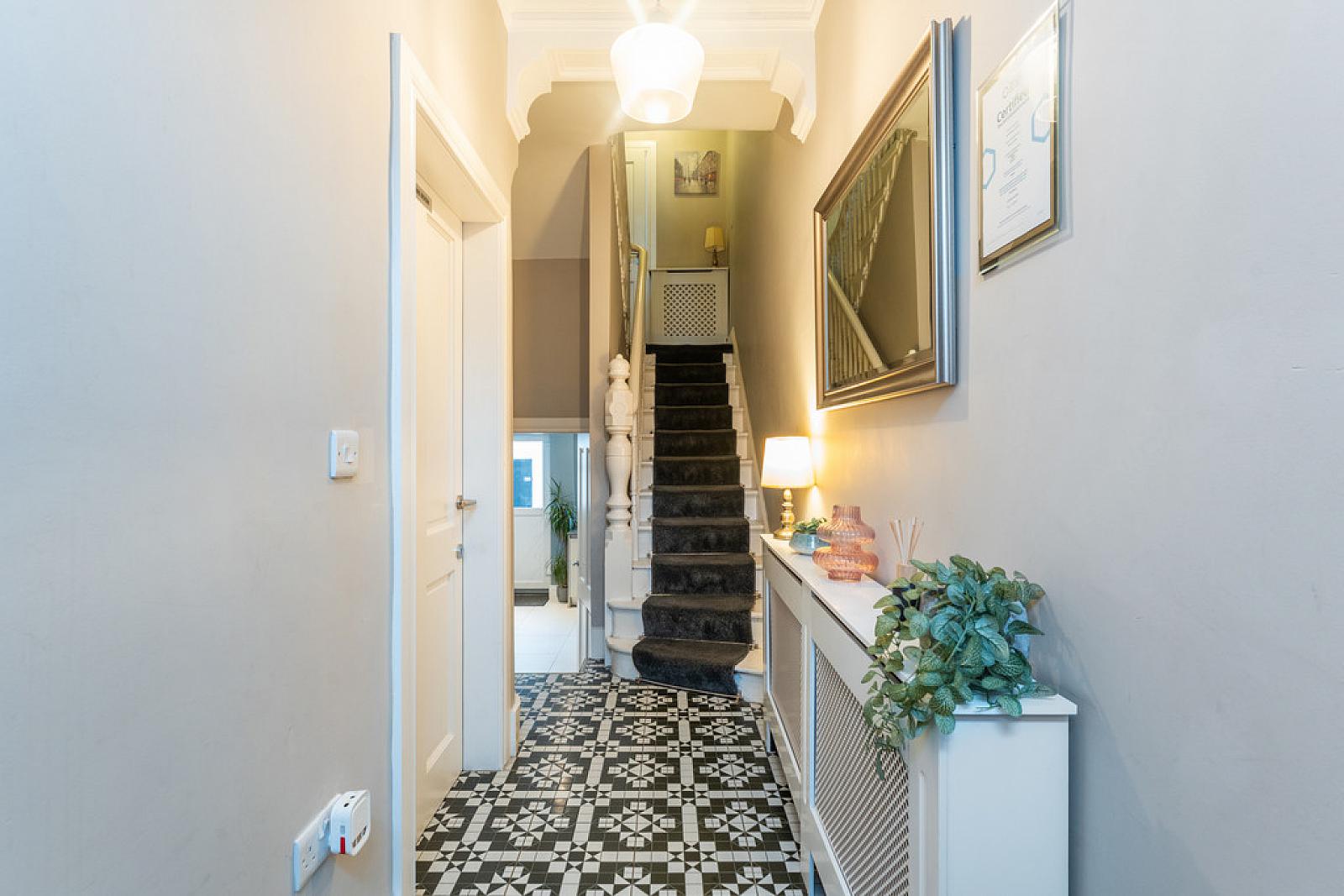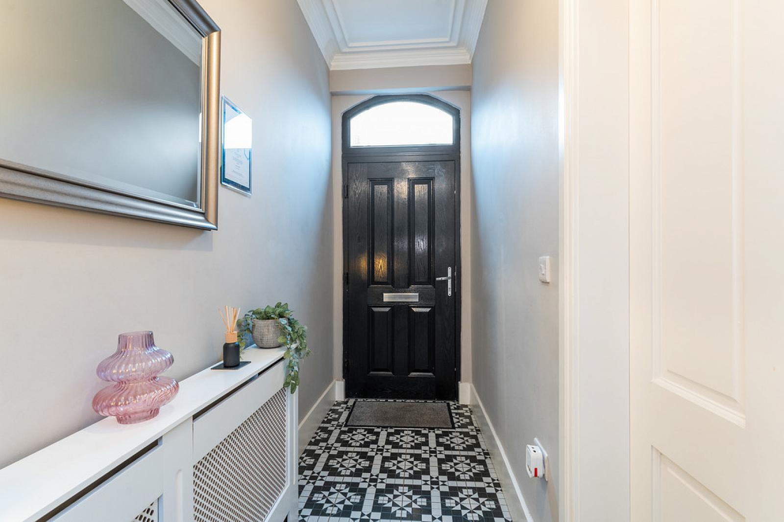 RECEPTION HALL Feature black and white tiled floor, cornice ceiling.