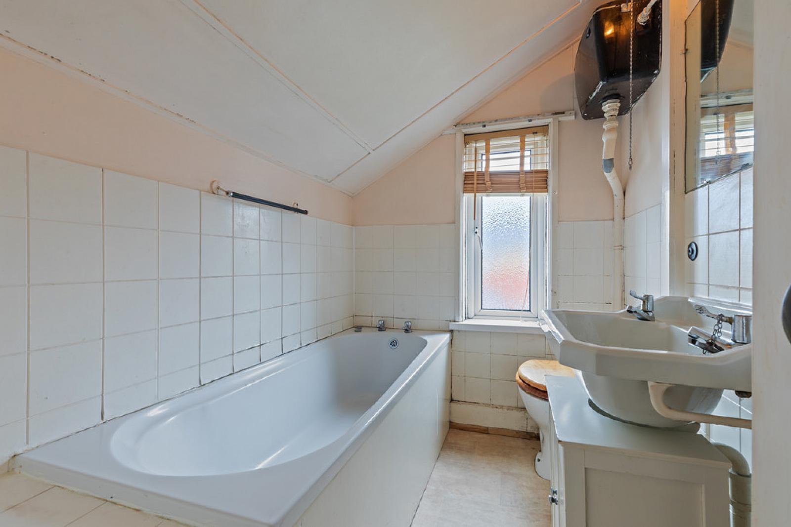 BATHROOM Panel bath with chrome taps, wash hand basin with storage under, w.c, partly tiled walls.