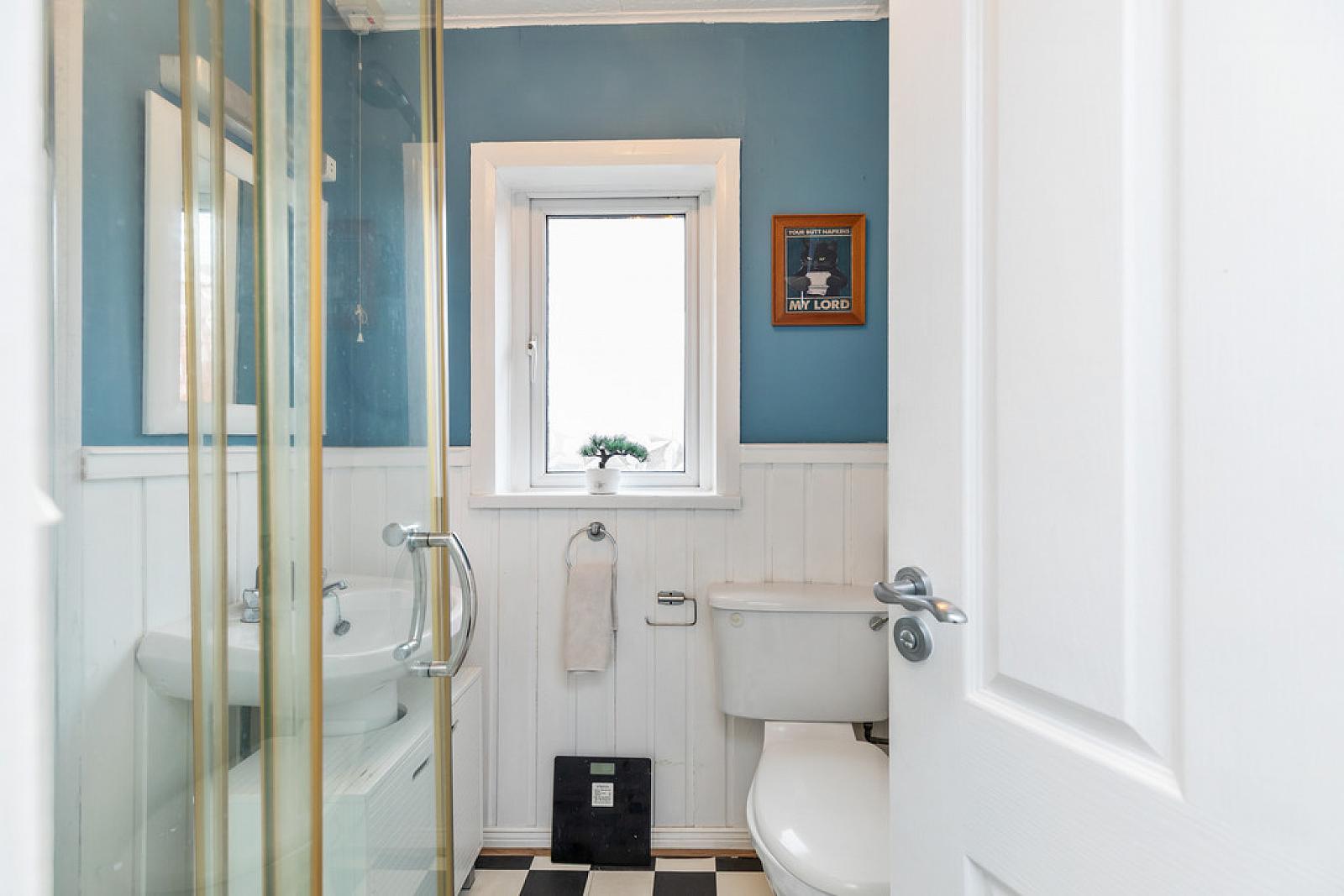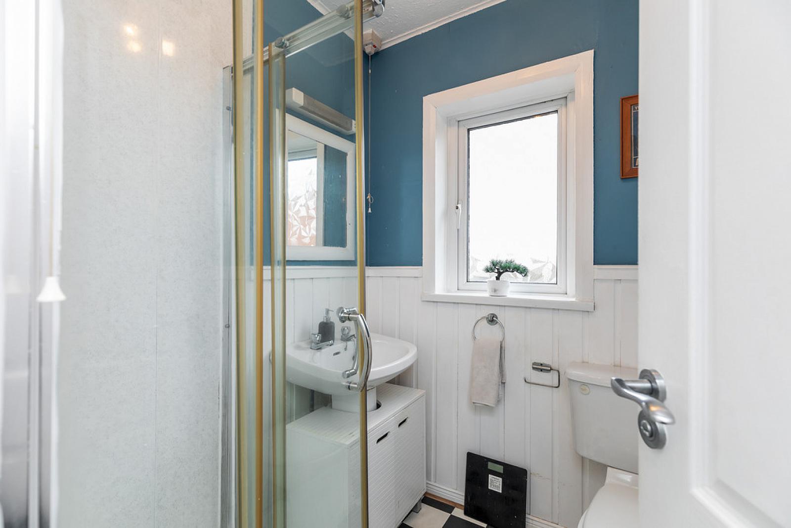 SHOWER ROOM Enclosed shower cubicle with Triton shower unit, pedestal wash hand basin, low flush WC, part timber panelled walls.