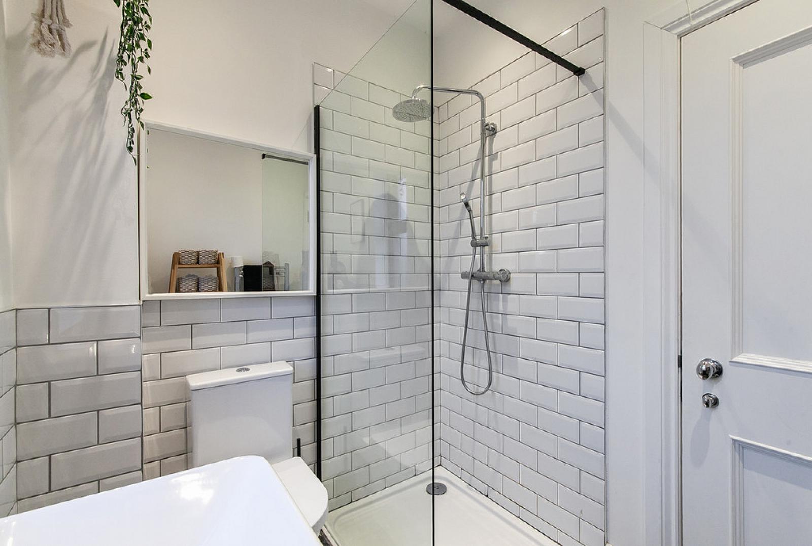 MODERN SHOWER ROOM White suite comprising low flush wc, vanity unit with storage, walk in fully tiled shower cubicle, part tiled walls