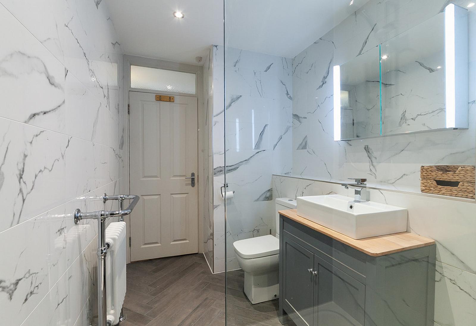 MODERN SHOWER ROOM Fully tiled walk in shower unit with electric shower. Vanity wash hand basin with mixer tap. Low flush wc. Traditional heated towel radiator. Extractor fan. Wall mounted fixed mirror unit. Fully tiled walls. Tiled floor.
