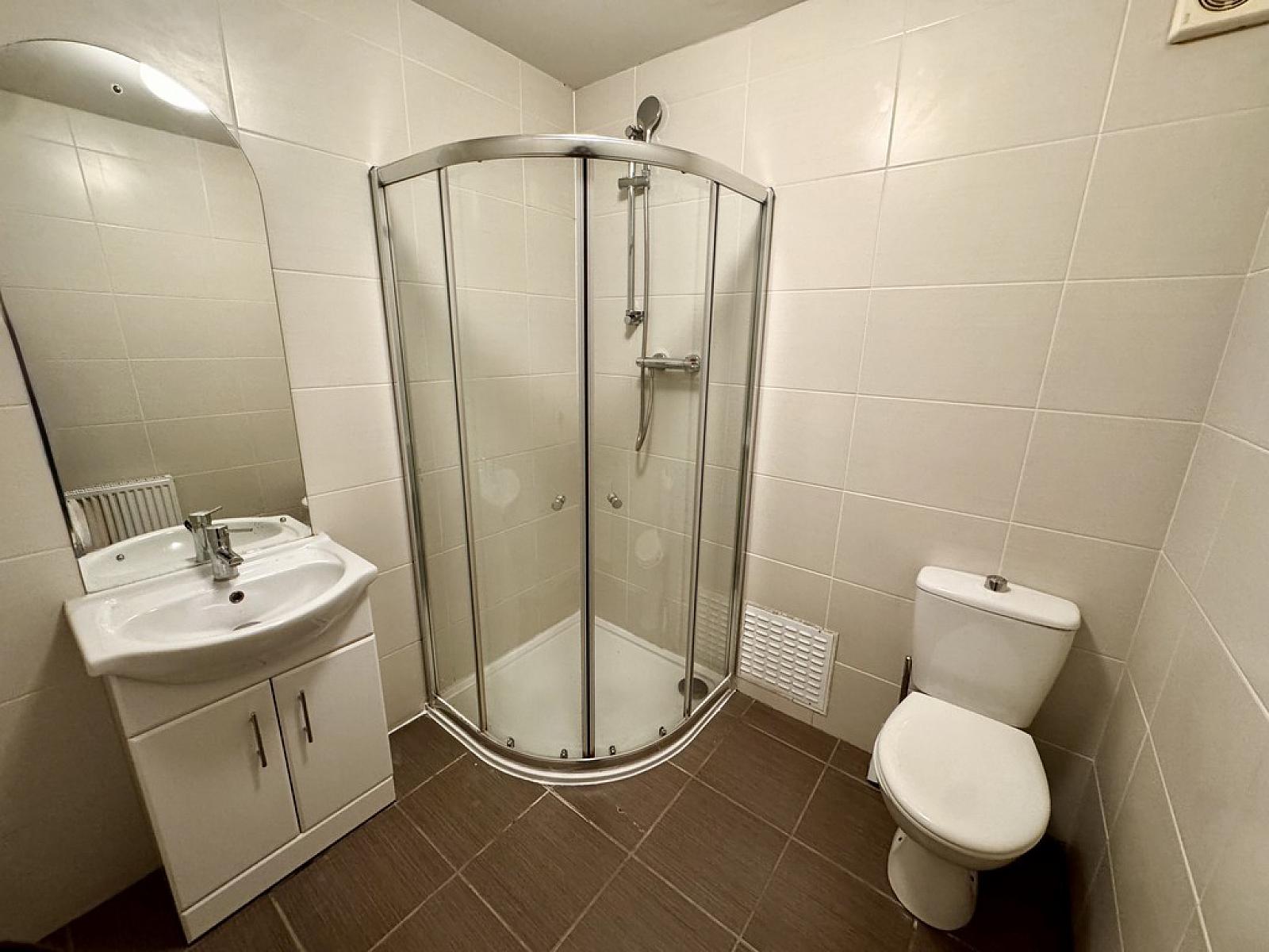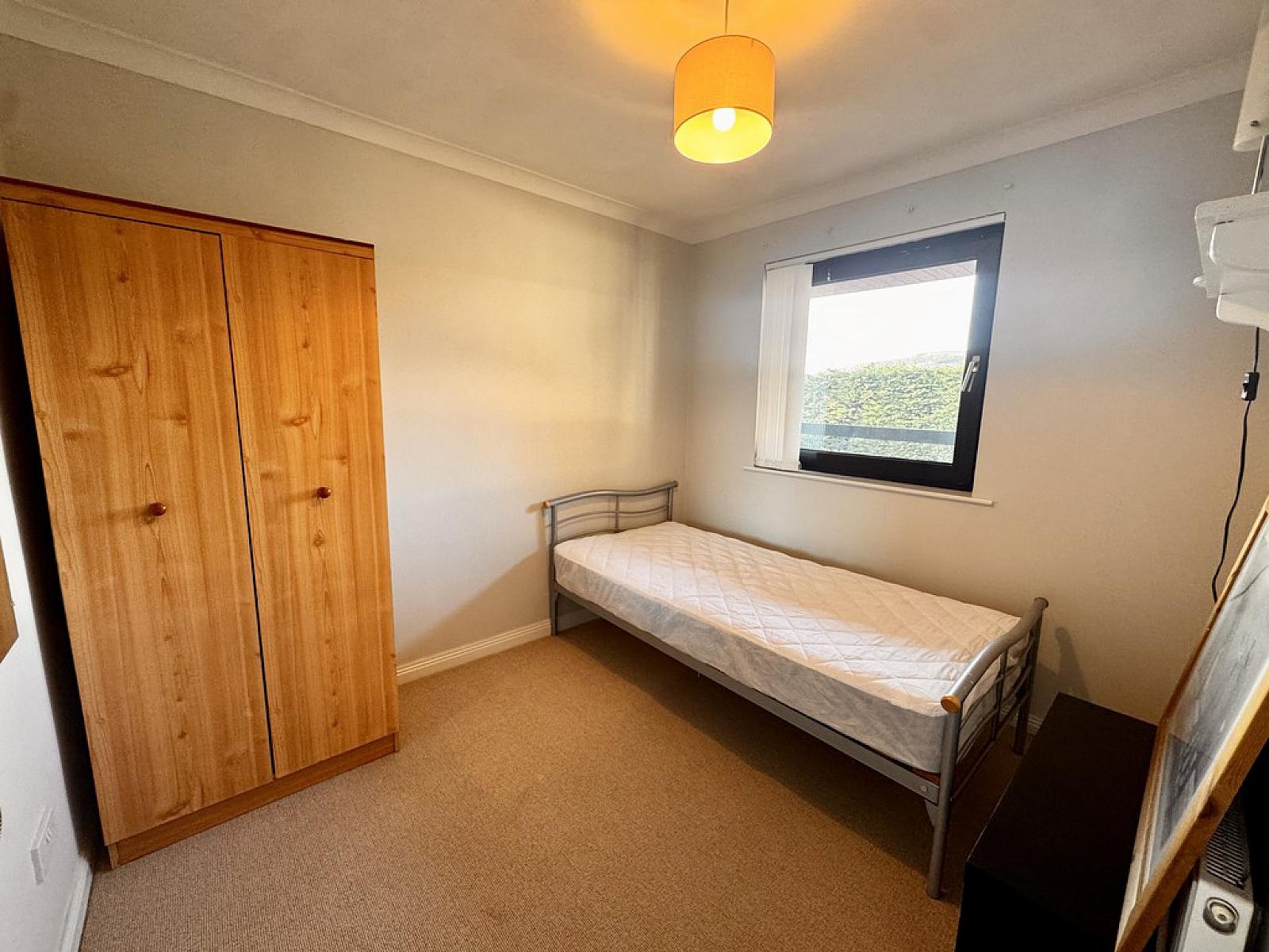 The property offers two well-proportioned double bedrooms, including a principal bedroom with sliding wardrobes and a spacious storage cupboard. The bathroom is fitted with a shower unit, WC, and wash hand basin.