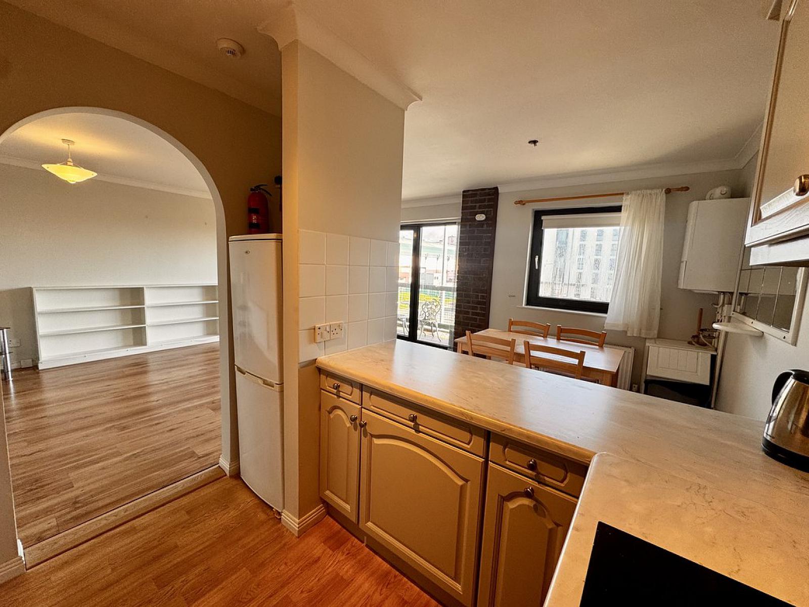 Internally, the entrance hallway leads to a bright, open-plan living, kitchen, and dining area positioned at the front of the building, overlooking the Lisburn Road. The kitchen is fully fitted, and the apartment has been freshly painted throughout.