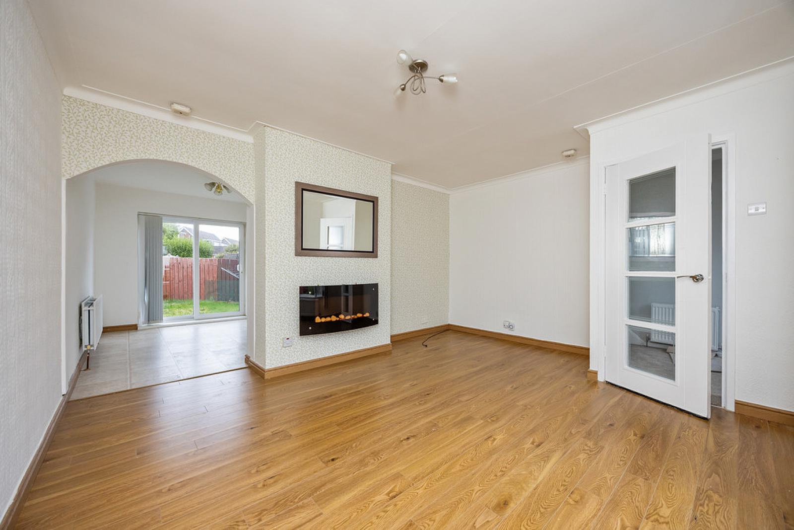 LIVING ROOM 15' 1" x 12' 3" (4.62m x 3.75m) Wood strip flooring, wall mounted electric fire, feature arch to dining room.